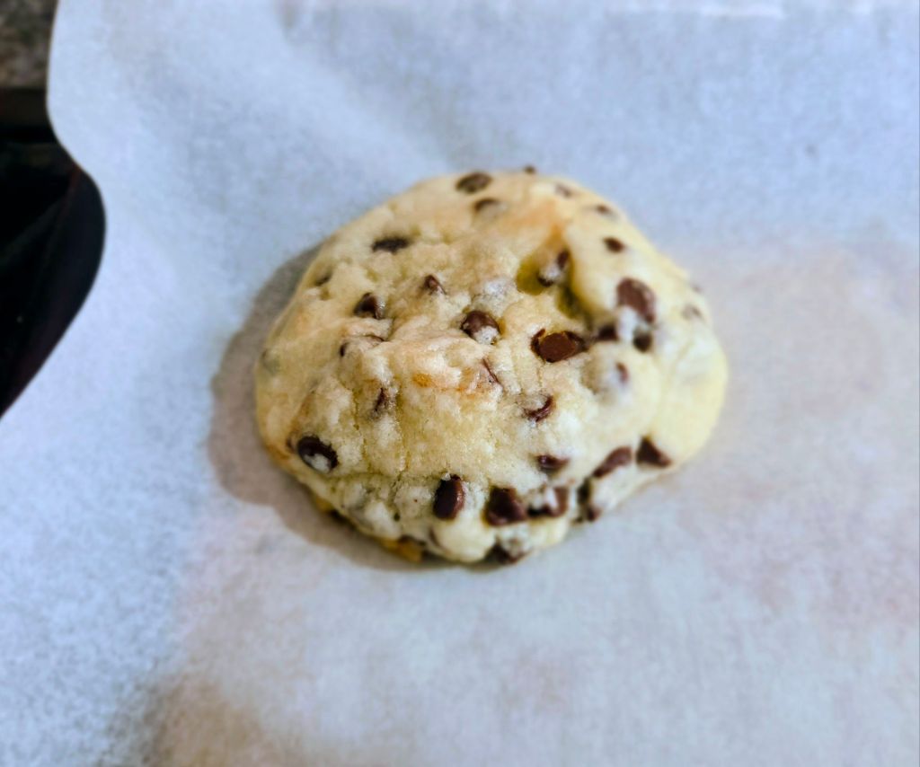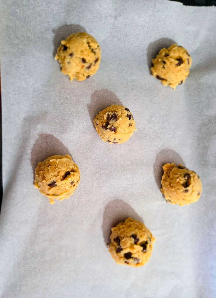 Directions- in a bowl, cream butter, sugar and brown sugar.  Add eggs and vanilla.  Mix in dry ingredients.   If dough seems a little dry, add a tbs or two of water.   Mix in chips and ground nuts.  Scoop out 1/4 cups of dough.  Chill a few hours.  When ready to bake, preheat oven to 375 degrees. Line a cookie sheet with parchment paper.  Stagger cookies on sheet, like below, because these do spread a bit.