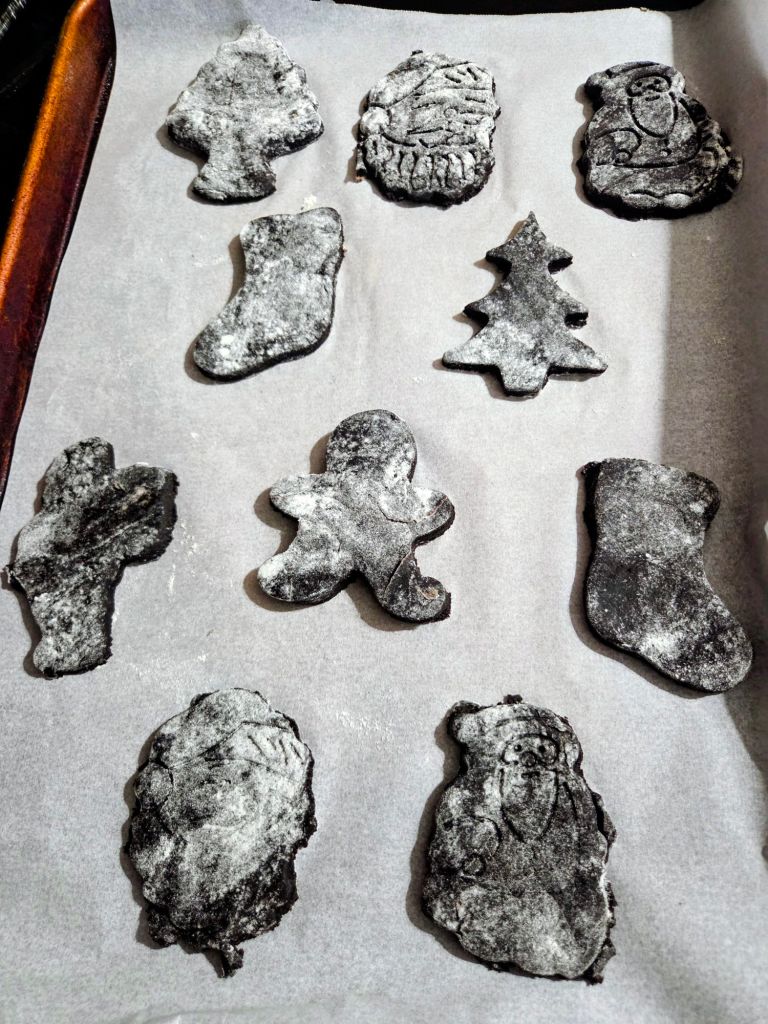 I am trying to make as many different cutout cookies for Christmas as I can before Santa arrives on the 25th.  So far, I have made gingerbread men, a chocolate chip version, and chocolate version, using regular unsweetened cocoa.    Today, I made a black cocoa version.