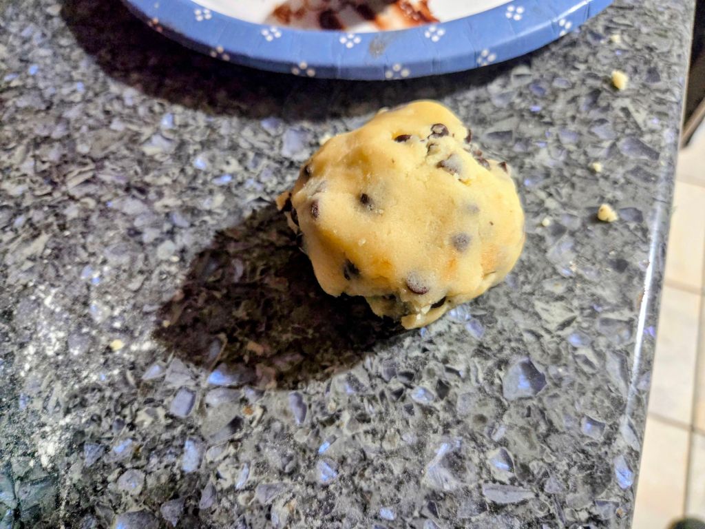 Directions – in a bowl, cream butter and sugar.  Add vanilla.  Mix in salt, flour and baking powder.  Fold in chips.  Scoop out 1/4 cups of dough.  Divide in half and flatten each half.   Place a frozen scoop of filling on top.