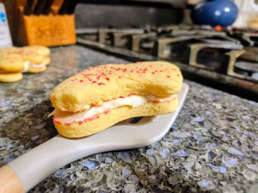 For my last Christmas cutout cookies recipe for this season, here are the traditional sugar cookies.  I made most of  them into cookie sandwiches so people can actually tell what they are.