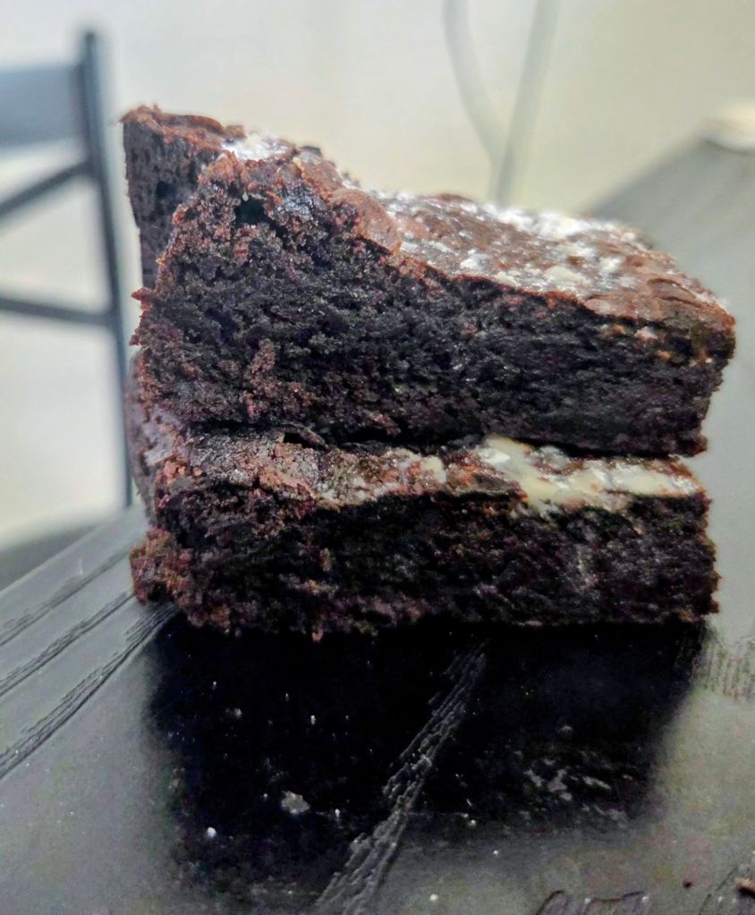 Directions -Preheat oven to 350 degrees.  Line an 8×10 pan with parchment paper and set aside.  In a bowl, combine melted butter and brown sugar.  Add eggs and vanilla.  Mix in dry ingredients.    Pour in water and just stir until batter evenly blended.  Pour into prepared pan.  Bake 25 to 30 minutes, until a toothpick inserted in center comes out with a few moist crumbs.  Cool completely.