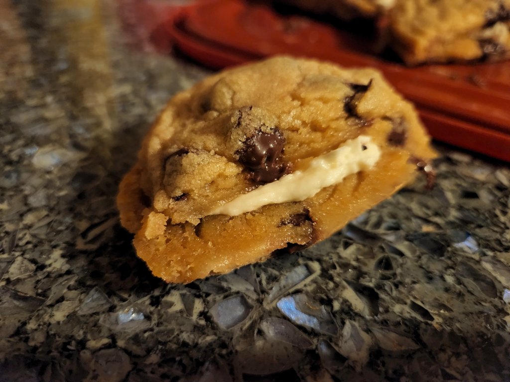 Place other flattened piece of dough on top. Make sure dough completely covers reeses. Stagger on prepared cookie sheet. Bake 10 minutes. Cool completely. Store in covered container