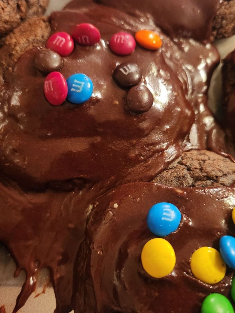 For topping – in a microwave safe bowl, combine 35 unwrapped hershey kisses and 1 tbs butter. Microwave in 45 second increments until you can stir smooth. Spoon on top of cookies.