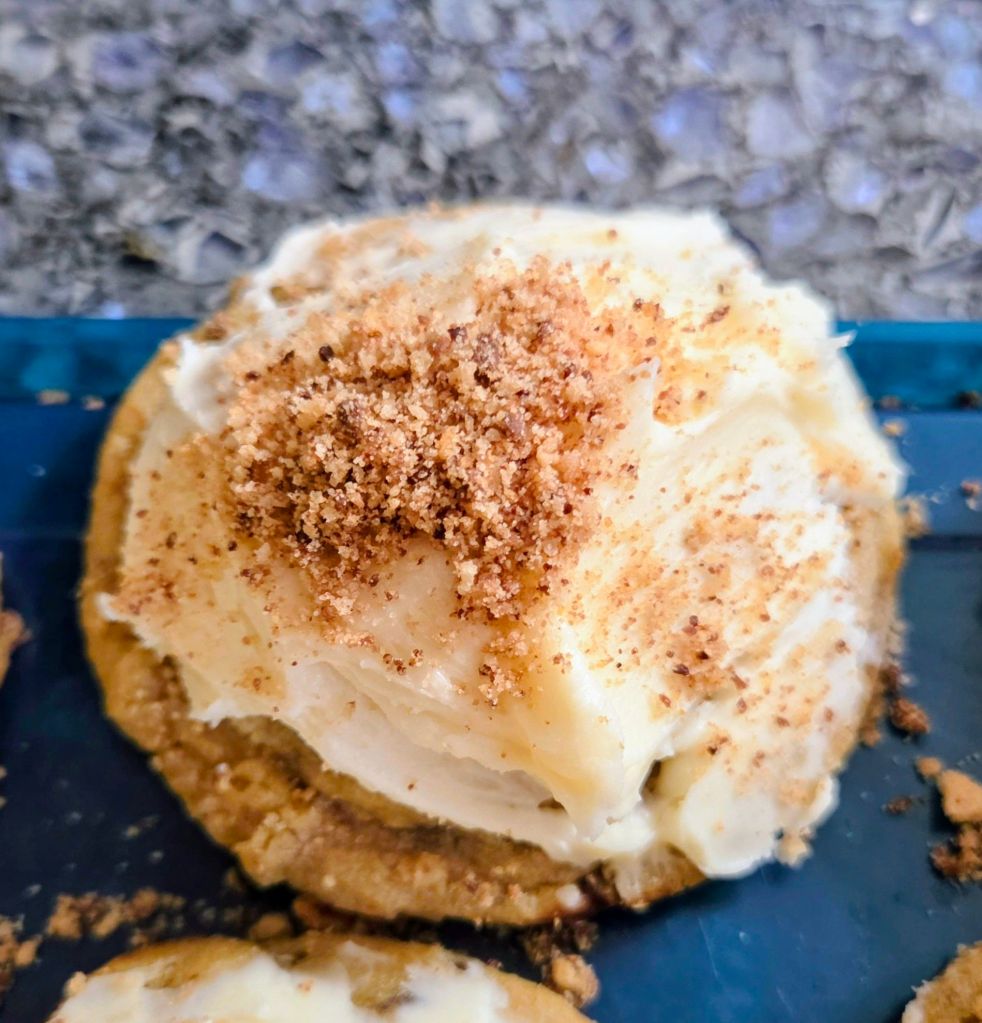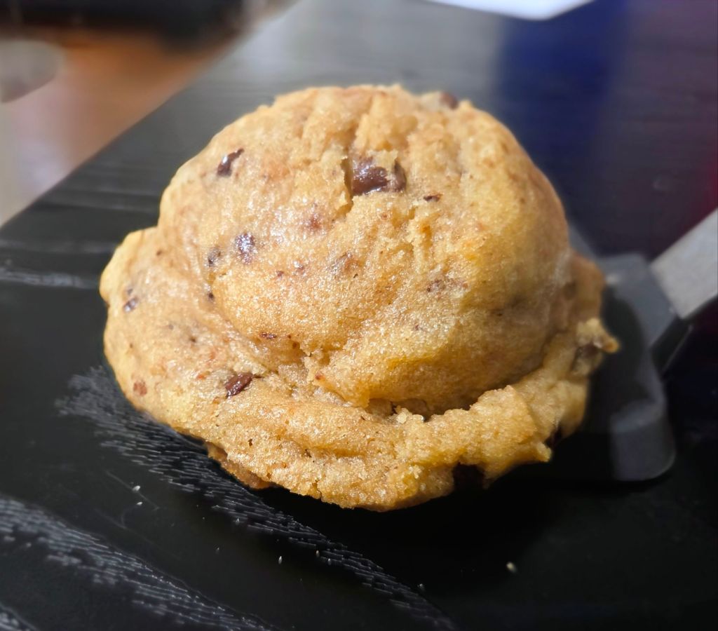 Directions – in a bowl, cream butter, brown sugar and sugar. Add eggs and vanilla. Blend in melted chocolate chips. Fold in dry ingredients. Mix in m&ms and milk chocolate chips. Scoop out 1/4 cups dough. Chill a few hours. Preheat oven to 350 degrees. Line a cookie sheet with parchment paper. Stagger cookies on sheet like below.