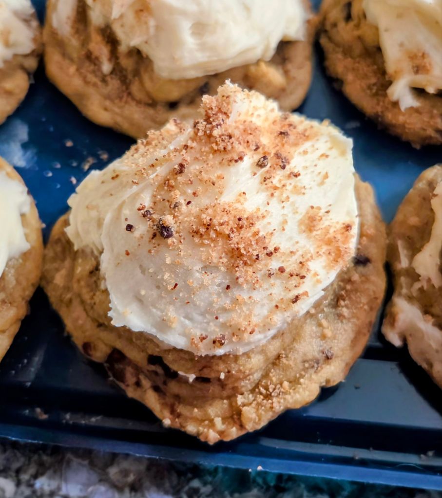 Bake 10 to 12 minutes, no longer. Right after removing from oven, gently press more milk chocolate chips on top of cookies.