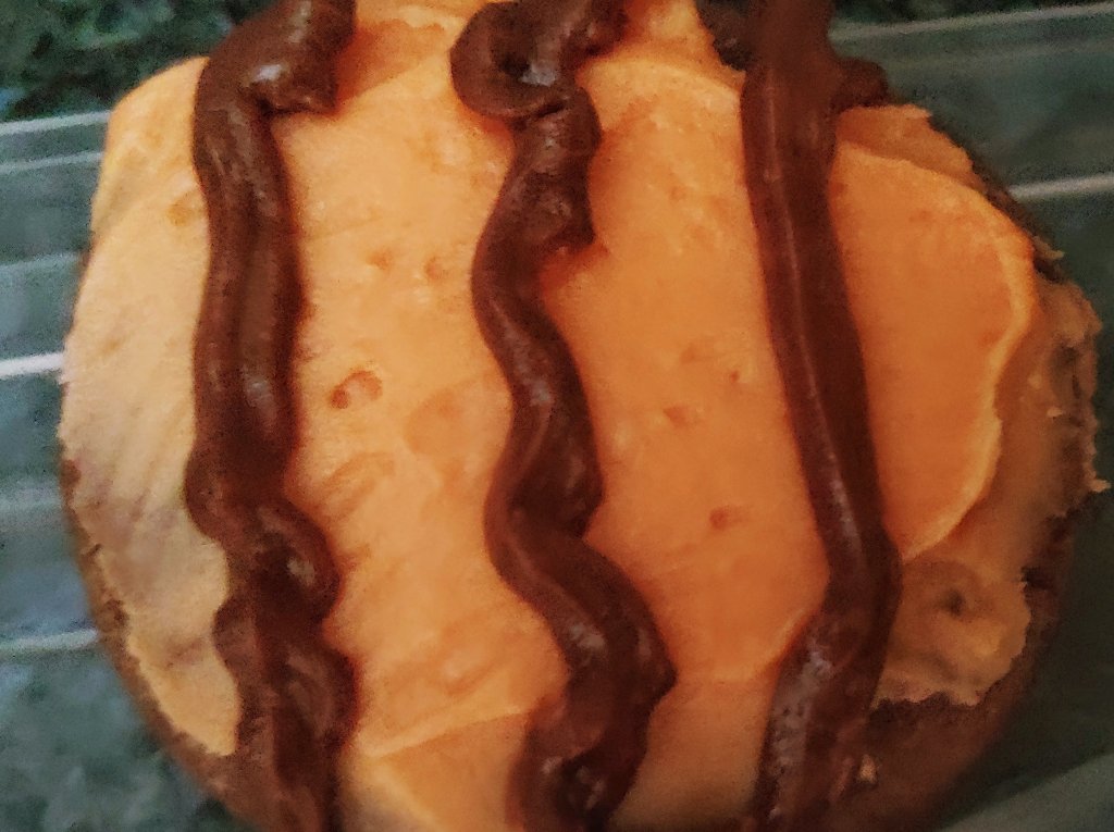 Directions – cream butter and powdered sugar. Add milk and vanilla. Using directions for orange on food coloring box, add food coloring. Frost cookies.