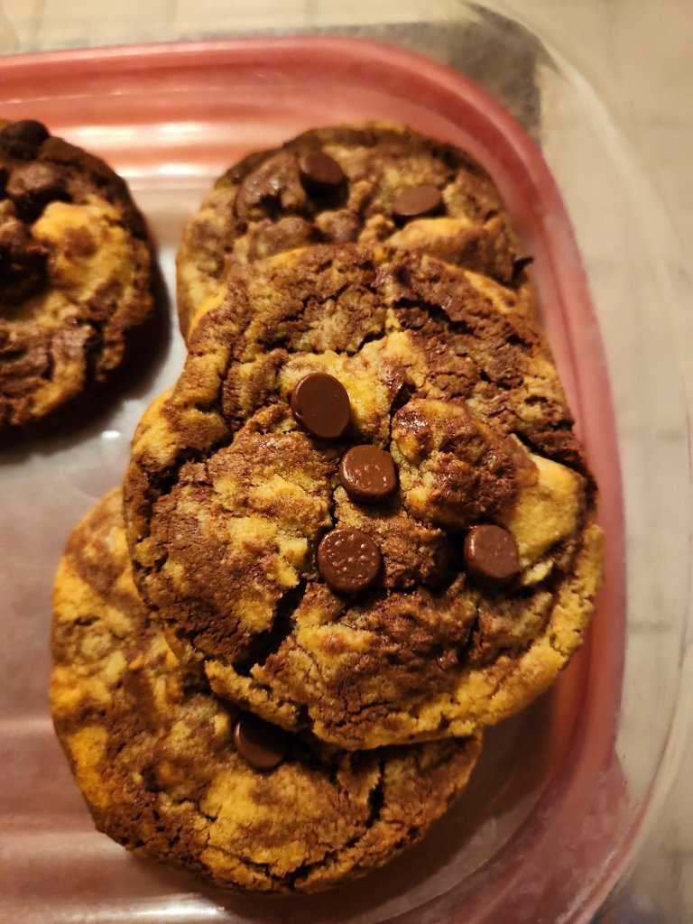 These are a soft, thick, puffy chocolate cookie with finely ground walnuts. You can leave them out if you want, use another kind, or throw in some chocolate chips.