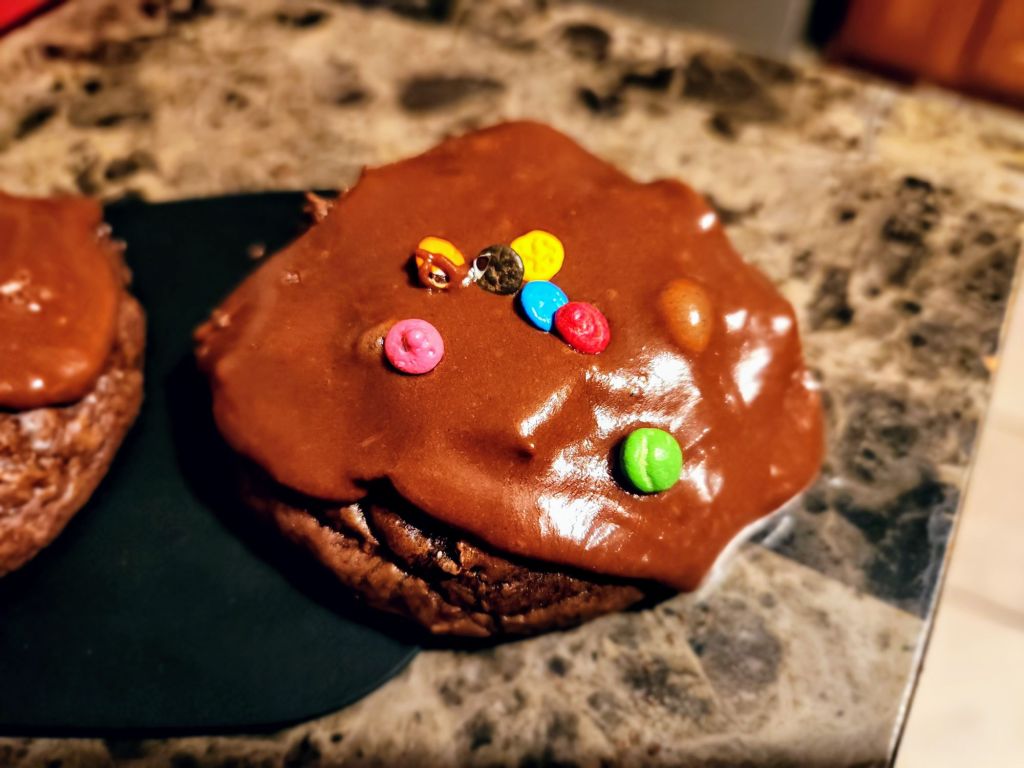 To kick off NFL week 14, I decided to mix a brownie mix, with a sugar cookie mix, add some eggs, melted butter and vanilla and bring this concoction into work. Not sure whether to call them sugar cookie brown bars or Brownie sugar cookie bars. And I frosted them with vanilla frosting and tossed some m&ms on top.