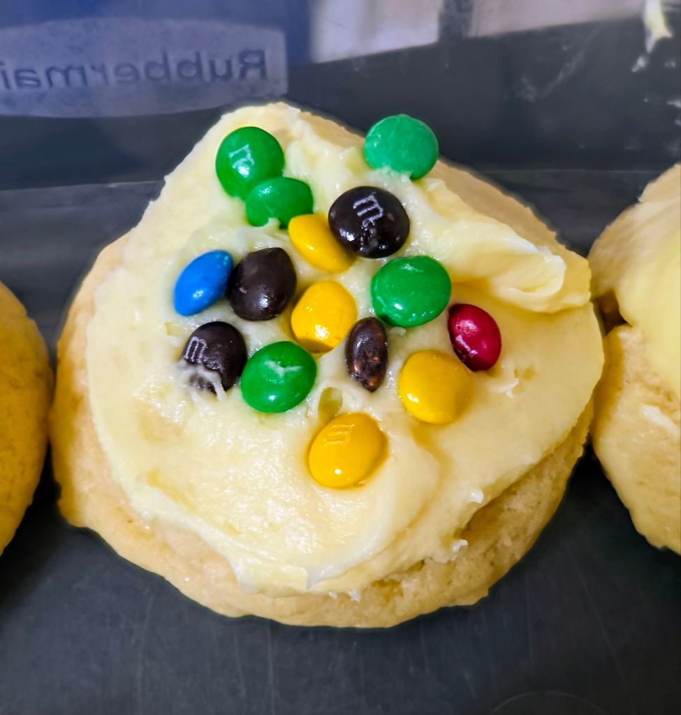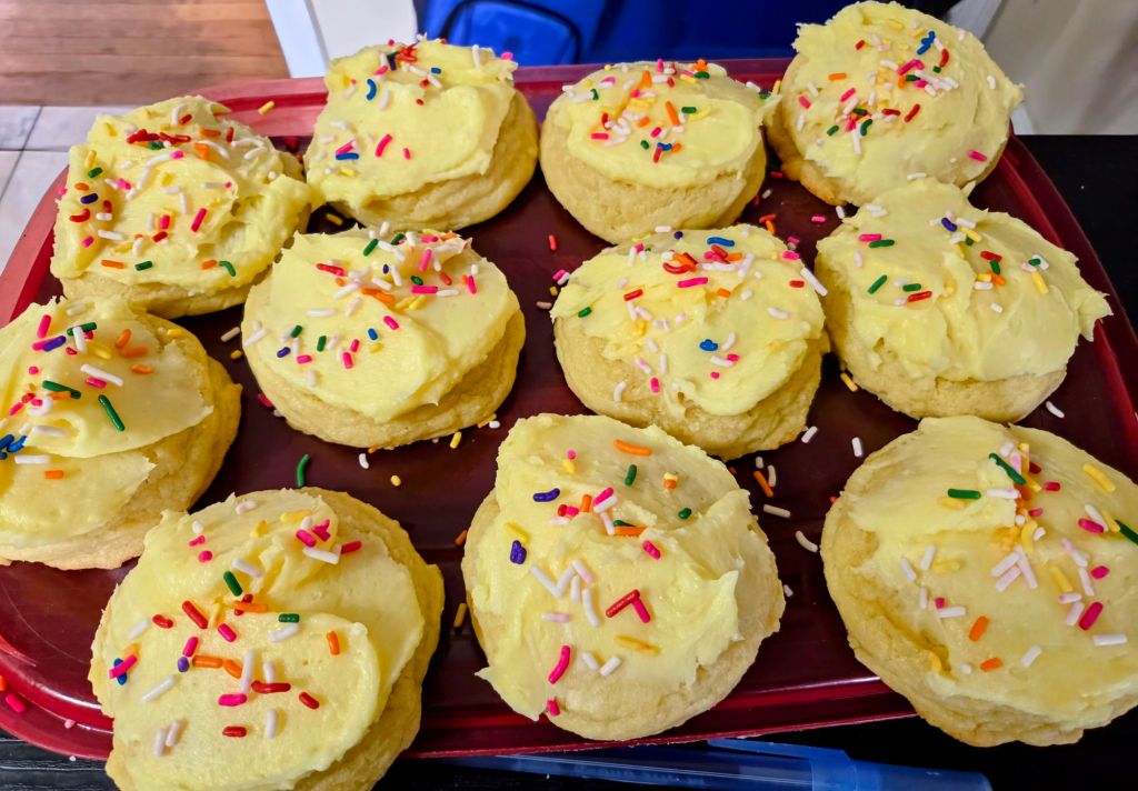 Directions – in a bowl, cream butter and sugar. Add eggs and extracts. Blend in dry ingredients. Fold in chips and funfetti. Scoop our 1/4 cups of dough. Chill a few hours. When ready to bake, preheat oven to 350 degrees. Line a cookie sheet with parchment paper. Stagger cookies on sheet. Bake 12 to 15 minutes. Remove from oven. Cool completely.