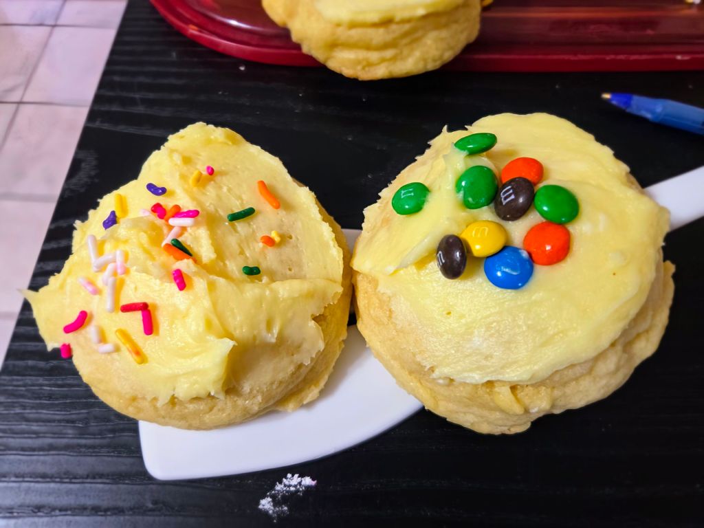 Sprinkles make people happy. So I made funfetti cookies with sprinkles and mini chocolate chips. And vanilla frosting makes them even better!