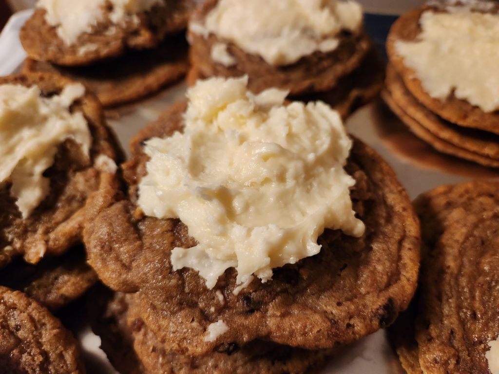 In a bowl, cream butter and vanilla. Blend in powdered sugar. Add enough cream to get the consistency you want. Frost cookies. Sprinkle extra crushed chips ahoy on top. Store in covered container.