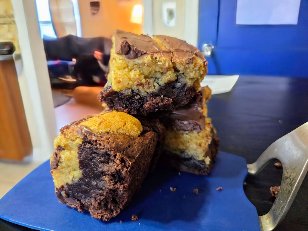 Directions – line a 9×9 pan with parchment paper. Set aside. in a bowl, combine butter and sugar. Add egg and vanilla. Blend in dry ingredients. Press half of dough every into prepared pan. Spread fudge filling on top. Evenly press remaining dough on top of filling. Freeze 30 minutes.
