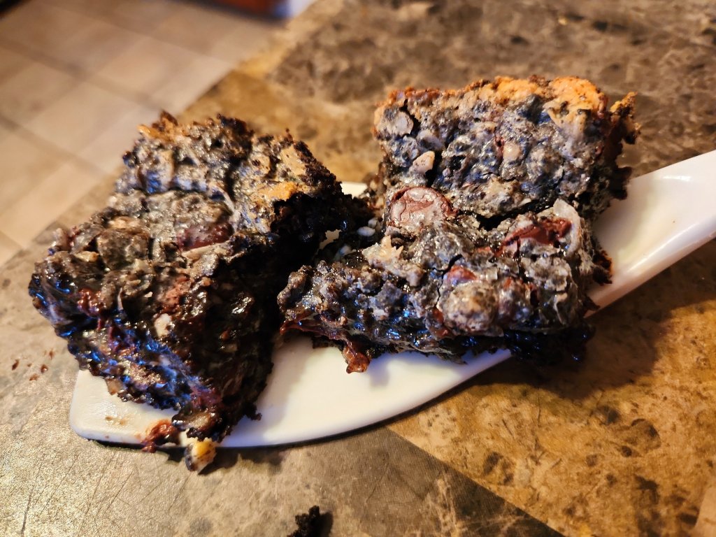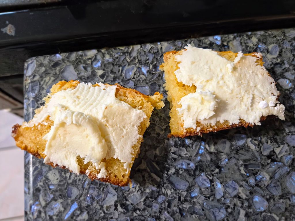 It is a typical summer day here today – hot and humid and close to 100 degrees. So what better treat to represent such a summer day than smores? And not just with graham crackers, but a graham cracker pound cake, some pieces topped with fluff frosting and melted hershey kisses and others topped with chocolate fluff frosting. The pound cake recipe is From one of my grandmothers, given to me a long time ago.