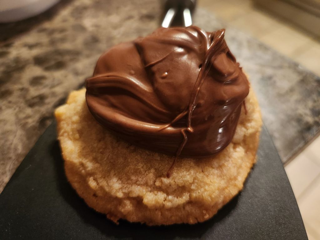 Directions – in a bowl, cream butter, crisco, peanut butter, sugar, powdered sugar and water. Add eggs. Fold in flour, baking soda, cream of tartar and salt. Scoop out 1/4 cups of dough. roll into balls. Spray the bottom of a glass with Pam and dip in extra sugar. Gently smush cookies (I left mine kind of thick). Chills for a few hours. Preheat oven to 350 degrees. Line a cookie sheet with parchment paper. Bake 9 to 11 minutes (no longer). Cool completely. Top with melted milk chocolate. Store in covered container.