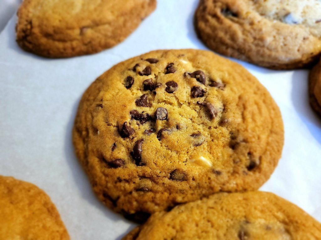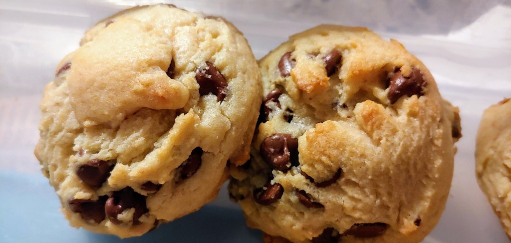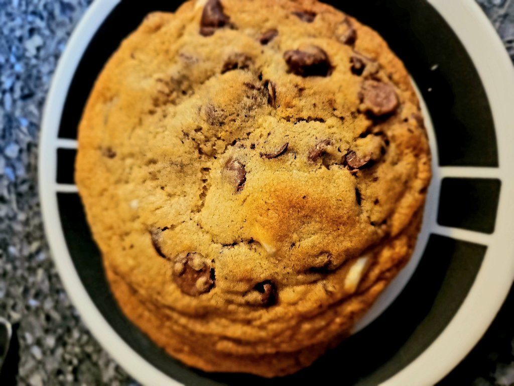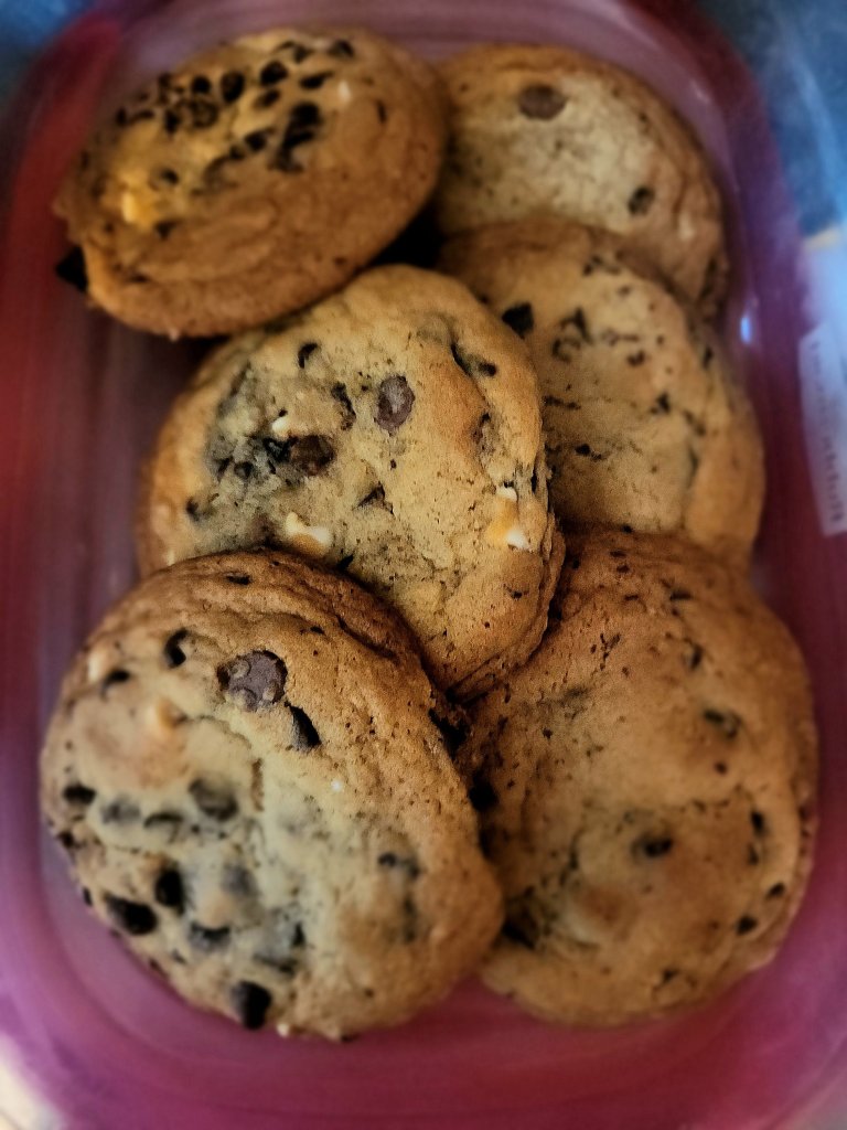 Directions – cream butter, sugar and brown sugar (instead of a mixer, I actually used my hands, like making meatballs). Add eggs and vanilla. Fold in dry ingredients. Mix in chips. Divide dough evenly into 12 pieces. Chill a few hours. Preheat oven to 350 degrees for 20 minutes. Line a sheet with nonstick baking liners. Stagger 6 cookies on the sheet. Bake 18 to 20 minutes. Cool completely. Store in covered container