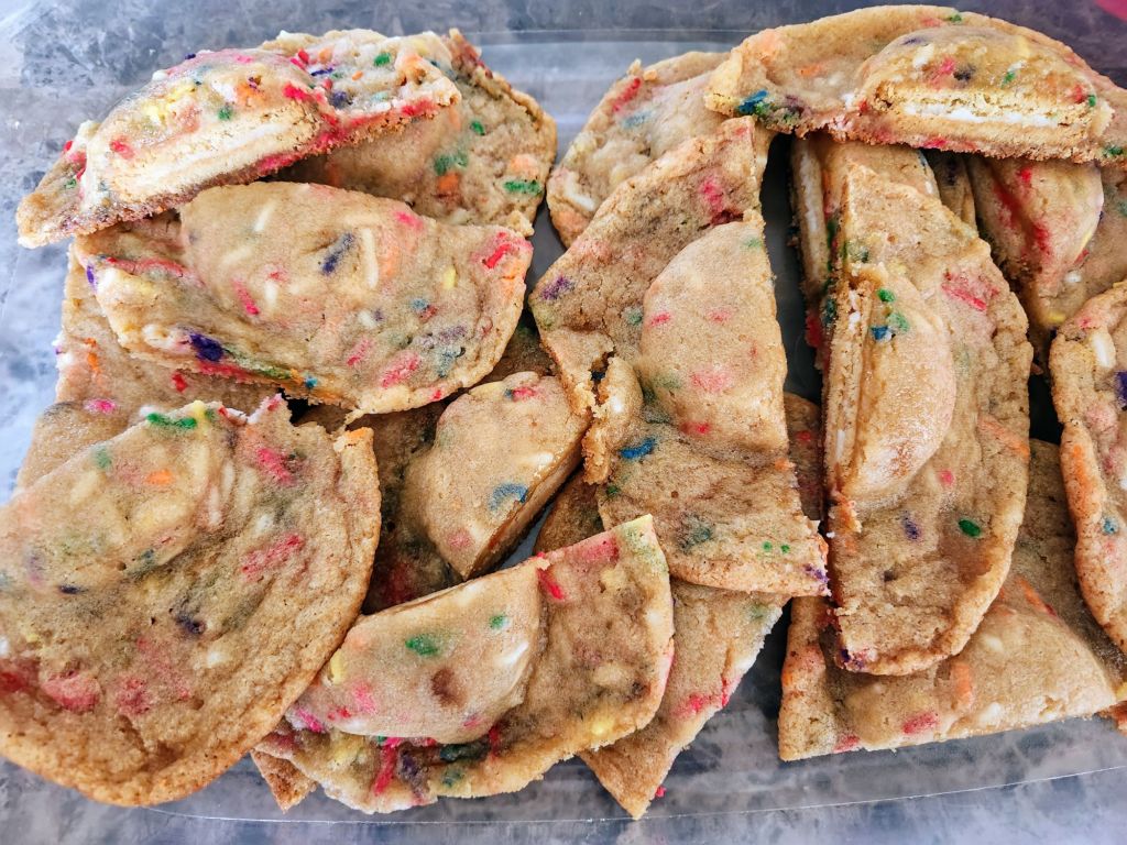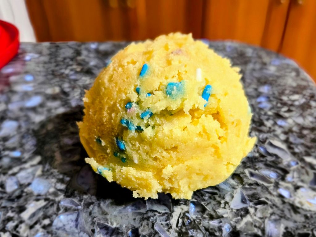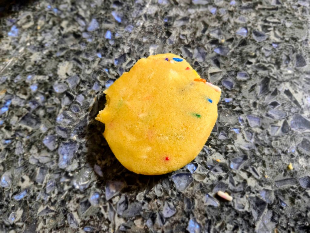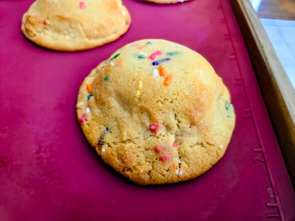Directions – in a bowl, cream butter and sugar. Add eggs and extracts. Fold in dry ingredients. Mix in sprinkles. Scoop out 1/4 cups of dough. Chill a few hours. Preheat oven to 350 degrees. Line a cookie sheet with parchment paper. Stagger cookies on it. Bake 11 to 13 minutes. They will likely be a little gushy on top. Pop them in the fridge to firm them up.