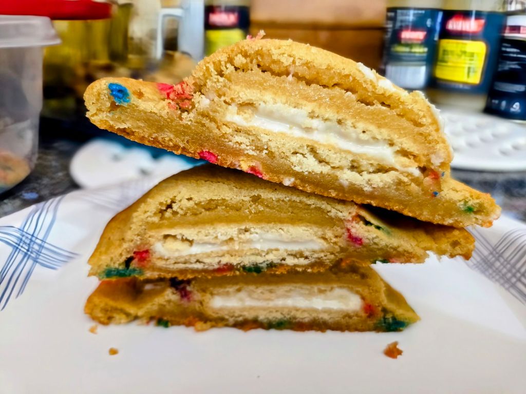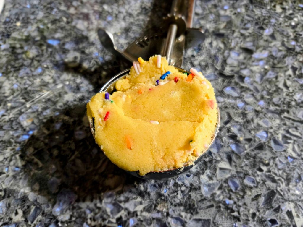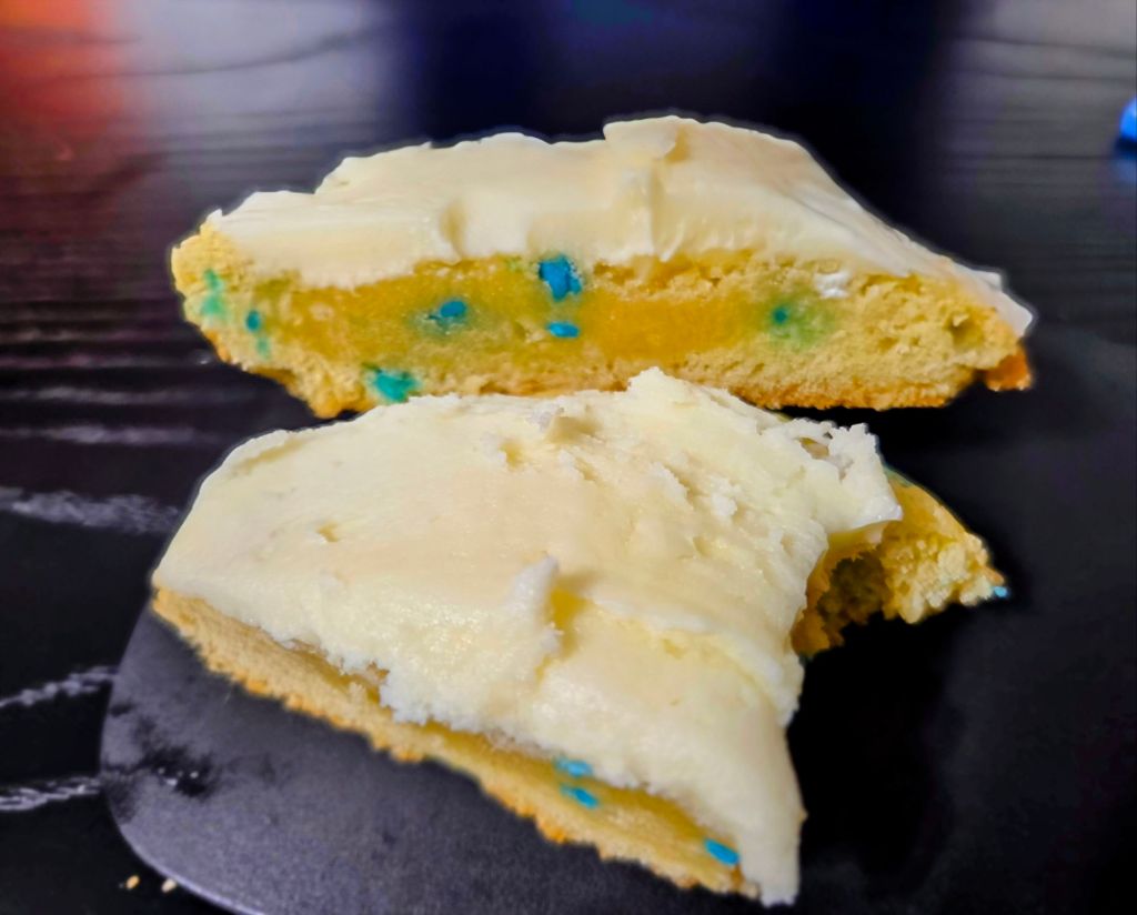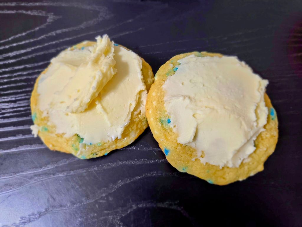 Directions – in a bowl, cream butter and sugar. Add eggs and extracts. Fold in dry ingredients. Mix in sprinkles. Scoop out 1/4 cups of dough. Chill a few hours. Preheat oven to 350 degrees. Line a cookie sheet with parchment paper. Stagger cookies on it. Bake 11 to 13 minutes. They will likely be a little gushy on top. Pop them in the fridge to firm them up.