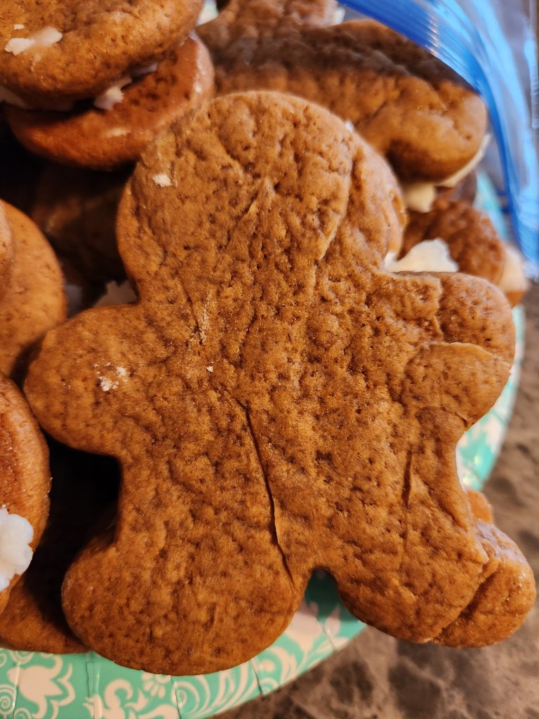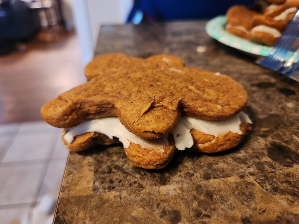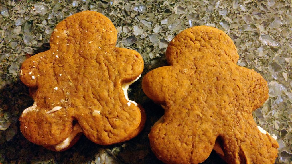 To celebrate our win over the Bengals (which was pretty stressful), I present gingerbread men/reindeer cookie sandwiches. One way they are gingerbread men,