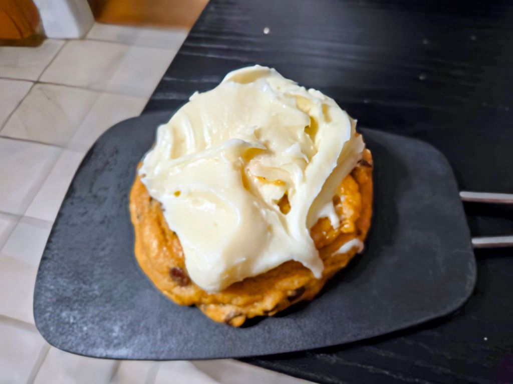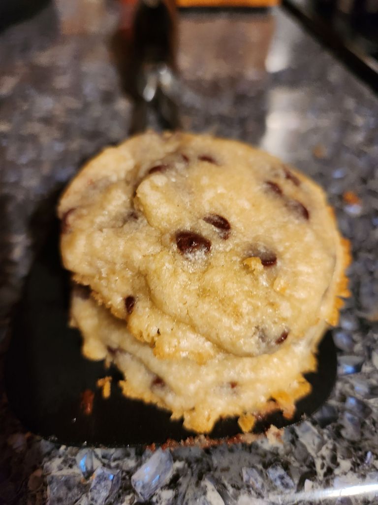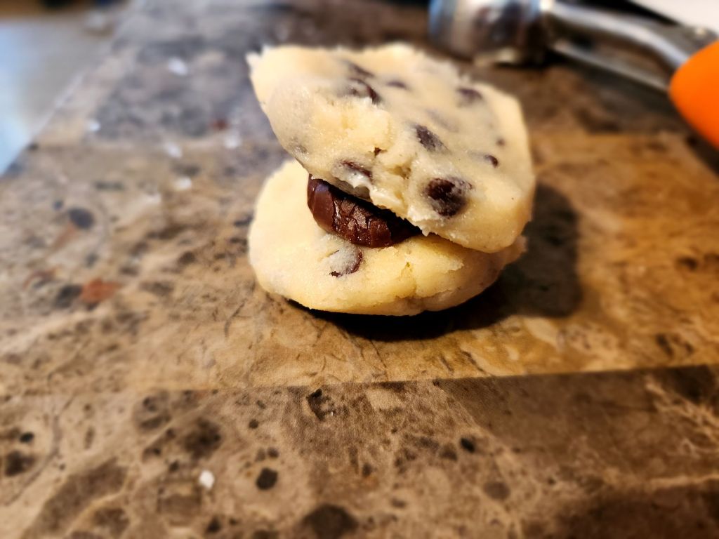 Directions – in a bowl, cream butter and sugar. Add vanilla. Mix in salt, flour and baking powder. Fold in chips. Scoop out 1/4 cups of dough. Divide in half and flatten each half. Place a frozen scoop of filling on top.
