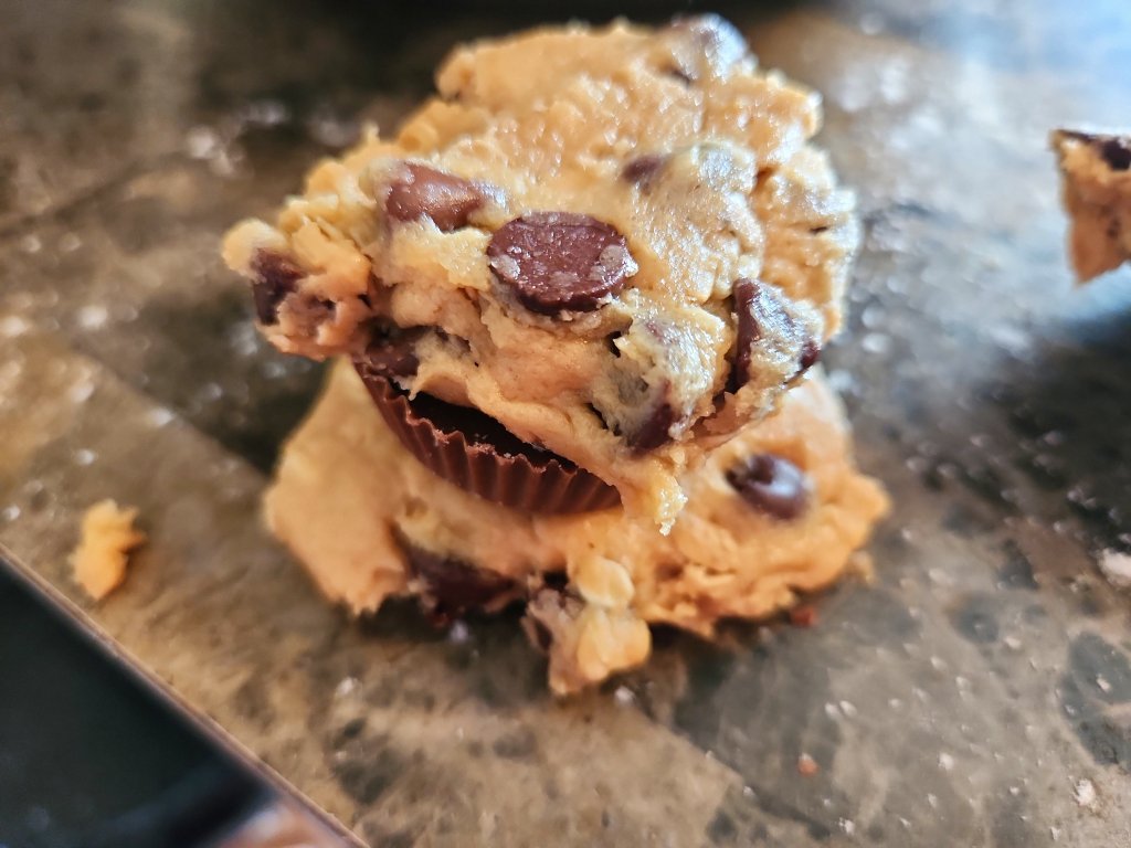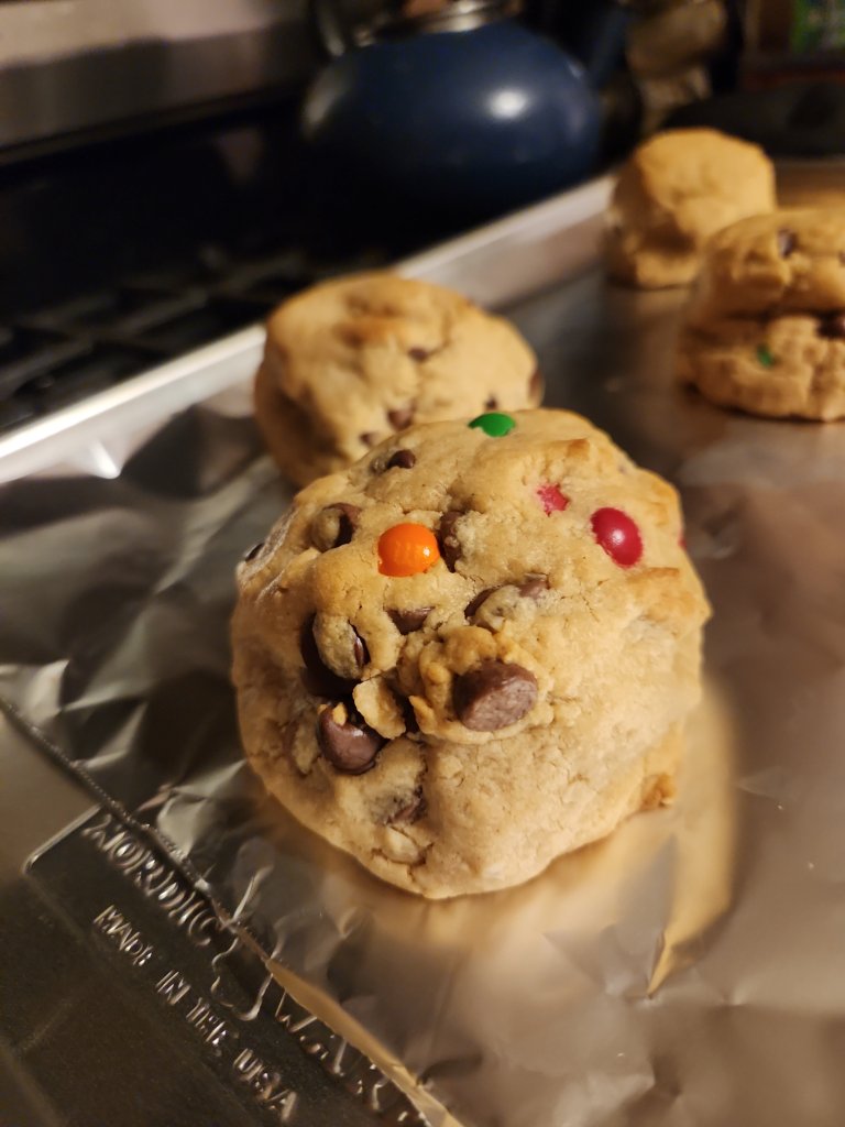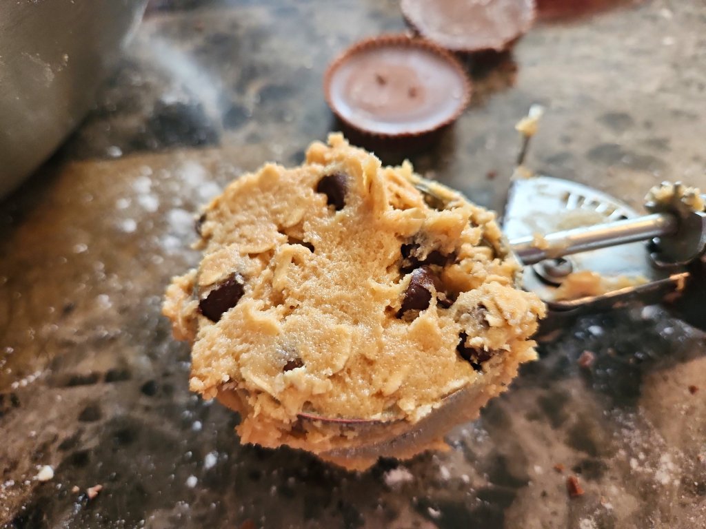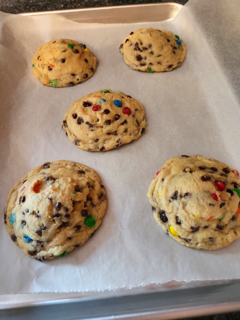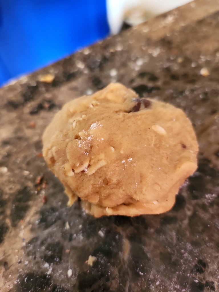 Directions – in a bowl, combine ingredients. Scoop out 2 tbs of dough (dough is soft). Place individual doughs in fridge for a few hours. Preheat oven to 375 degrees. Just before baking, i formed the doughs into tall mounds. Line cookie sheet with nonstick baking liners. Stagger cookies. Bake 8 to 10 min (no longer)
