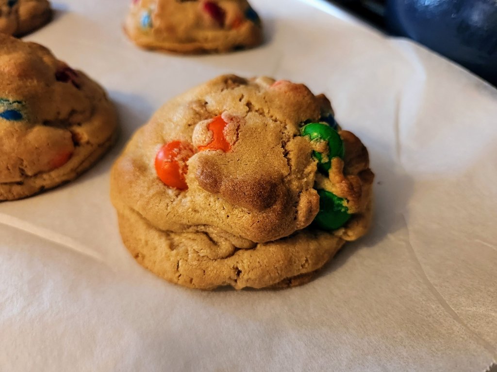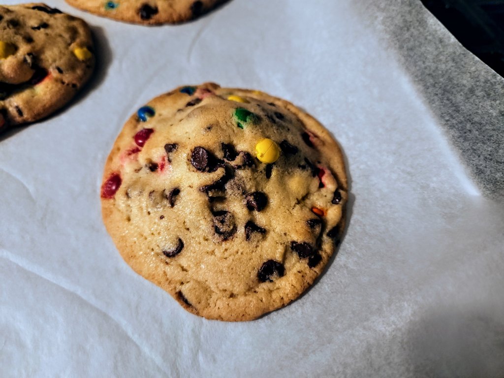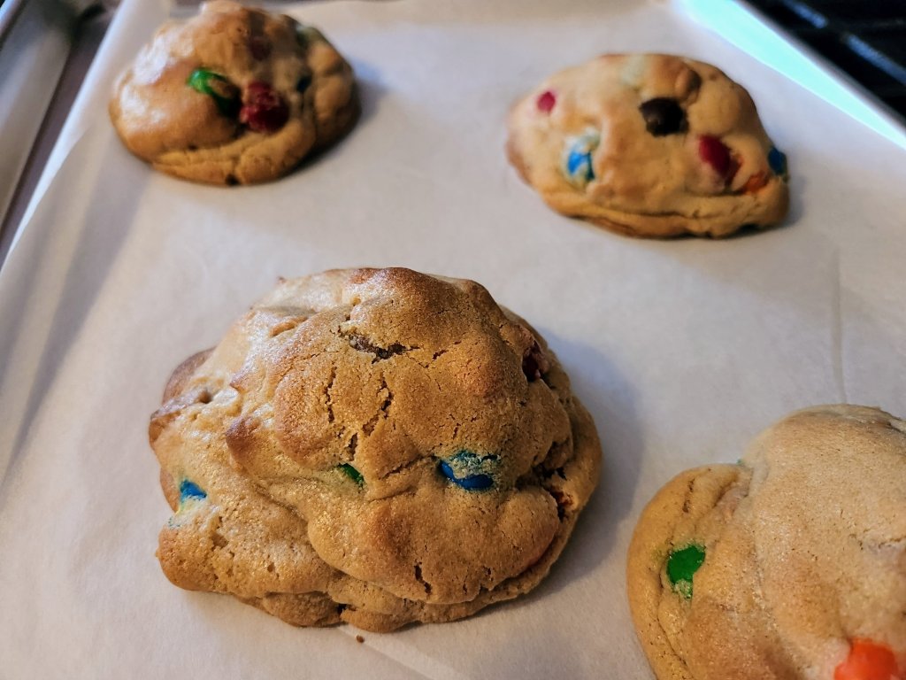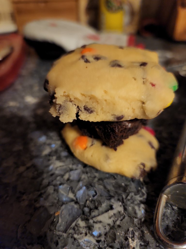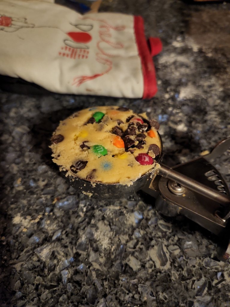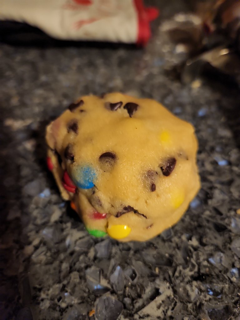 Directions – in a bowl, combine ingredients. Scoop out 2 tbs of dough (dough is soft). Place individual doughs in fridge for a few hours. Preheat oven to 375 degrees. Just before baking, i formed the doughs into tall mounds. Line cookie sheet with nonstick baking liners. Stagger cookies. Bake 8 to 10 min (no longer)