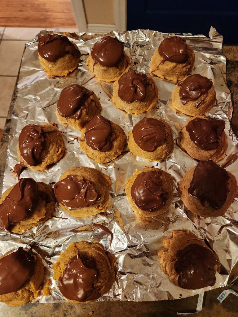 Directions – in a bowl, cream butter, peanut butter, sugar and brown sugar. Add eggs and vanilla. Blend in dry ingredients. Fold in nutter butters and peanuts. Scoop into 1/4 cups dough and roll into tall mounds. If you are going to chill or freeze these, flatten doughs slightly. Keep them tall if you are going to bake right away. Preheat oven to 350 degrees. Line a cookie sheet with parchment paper. Stagger cookies on sheet. Bake 10 to 11 minutes, no longer. They will be a little gushy, but you can pop them in the fridge to firm up.