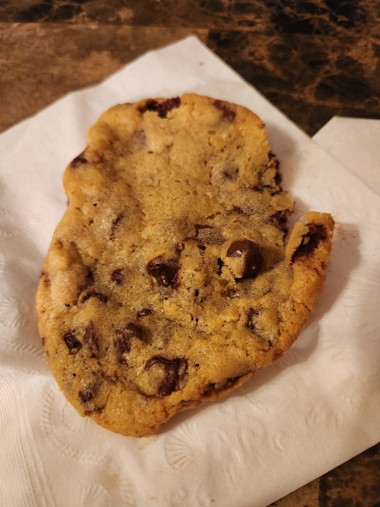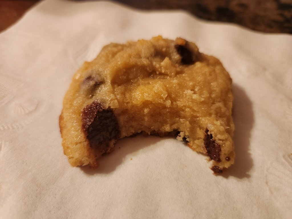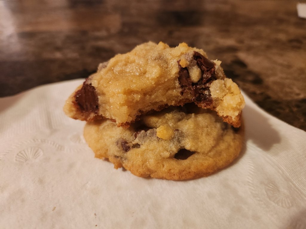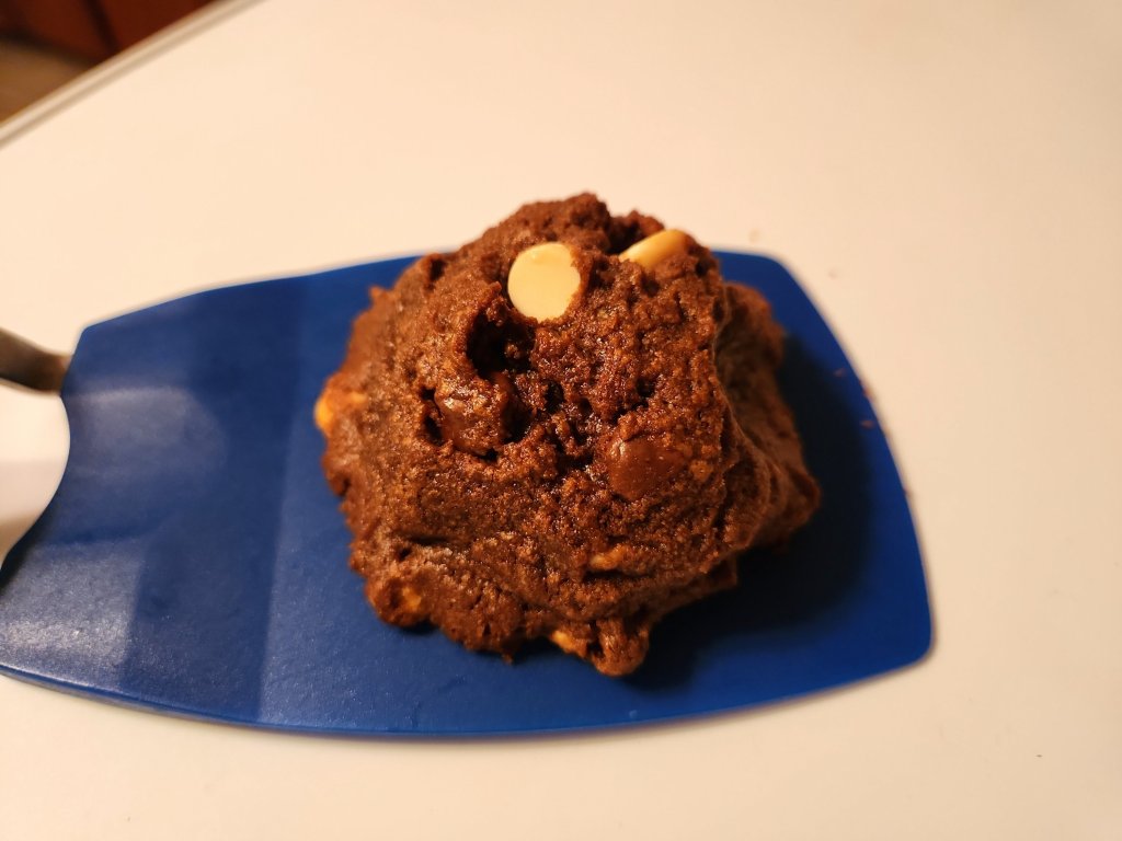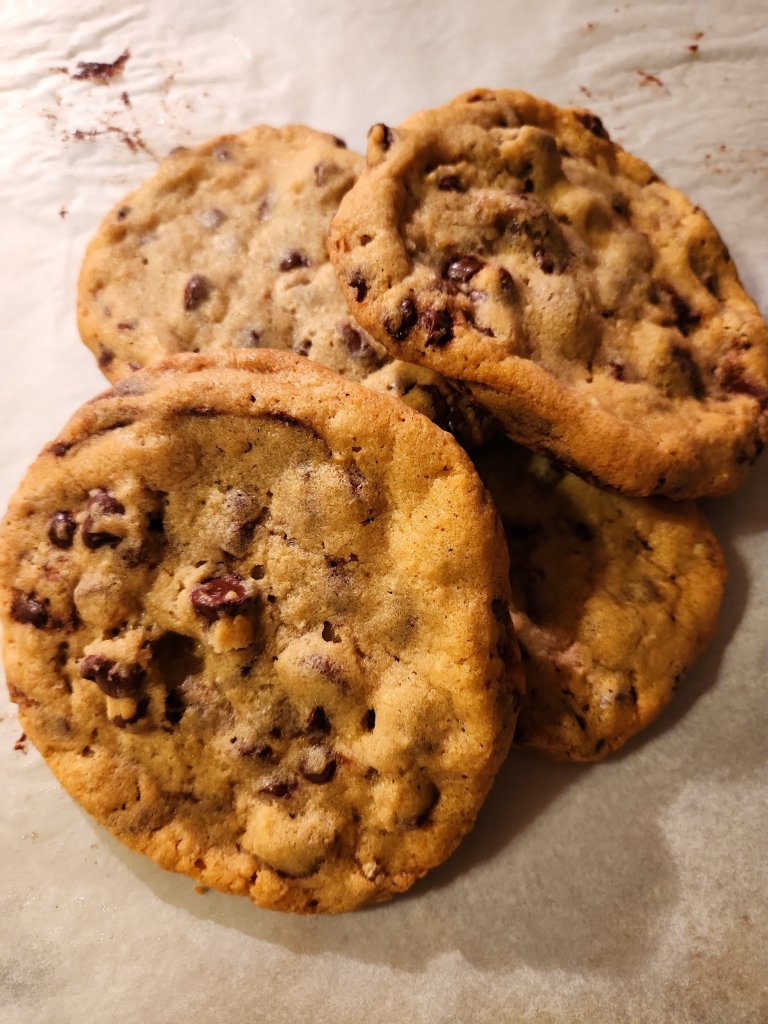 Directions – cream butter, oil, sugar, and brown sugar. Add eggs and vanilla. Blend in dry ingredients. Fold in chips. Scoop out dough (I used my cookie scoop that is 6 tbs worth). I formed them into tall mounds and chills them for at least an hour. Line a cookie sheet with parchment paper. Preheat oven to 350 degrees for 20 minutes before baking. Stagger cookies on prepared sheets. Bake 15 to 18 minutes. Cool completely. Store in covered container.