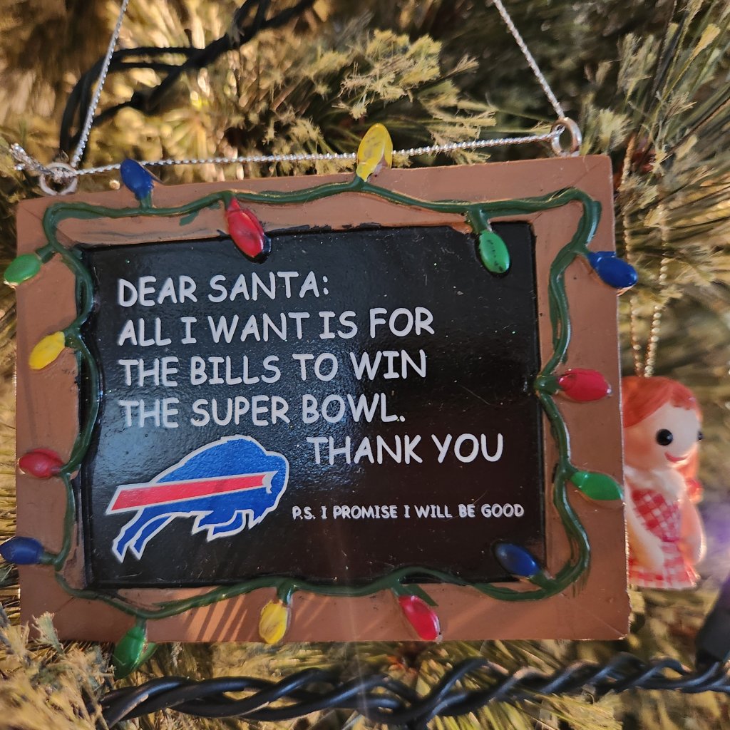 I put up both our trees this weekend.. and pulled put my favorite ornament. (I also love the red haired doll from Rudolph, which is right next to it). It is year 34 with this Bills ornamant, and am hoping Santa comes through this time!