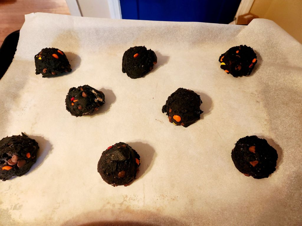 Chill and hour or two. Preheat oven to 350 degrees. Line a cookie sheet with parchment paper and stagger cookies.