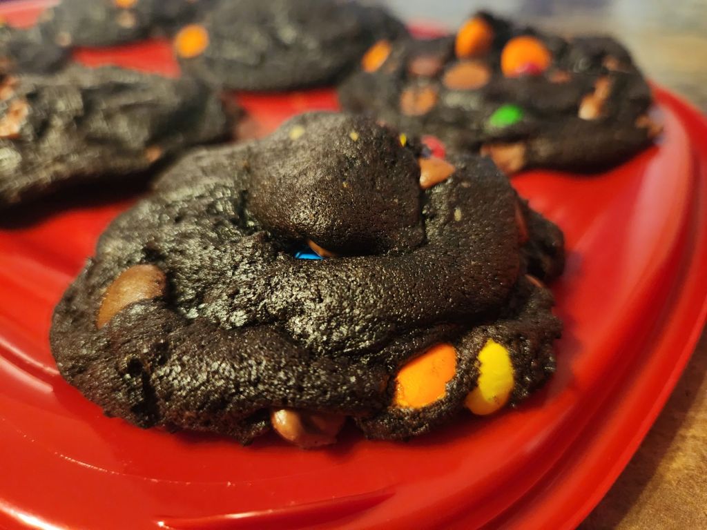 Directions -in a bowl, cream butter, peanut butter, brown sugar and sugar. Add eggs and vanilla. Blend in dry ingredients and oats. Fold in chips and m&ms. Scoop out 1 tbs dough and slightly flatten.
