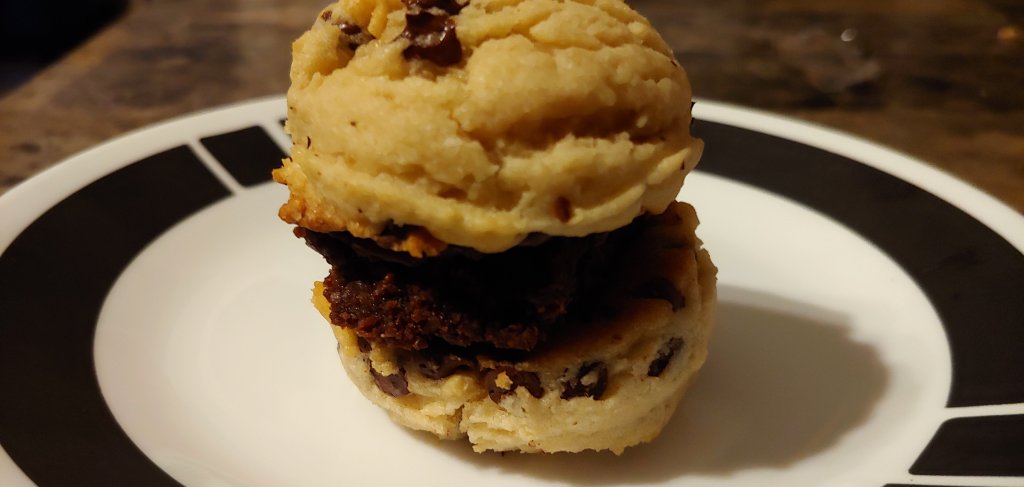 I was looking to whip up something for work tomorrow, as Rob, Gracie and I watch Islanders-Bruins game 2 and Maple Leafs-Canadiens game 7. So I settled on this treat. Quite simply put, are a chocolate chip cookie “sandwich” with a filling of a brownie. I have seen different versions of this, using reese’s peanut butter cups, mallo cups and brownies as the filling. I went with brownies this time. Although I am partial to puffy cookies probably a flatter cookie wouls be a better option next time. You can use any cookie and brownie recipe you want. I actually put a ganache on the brownies, thinking it might help the cookies stay on the brownie, but I think I just made it messier!