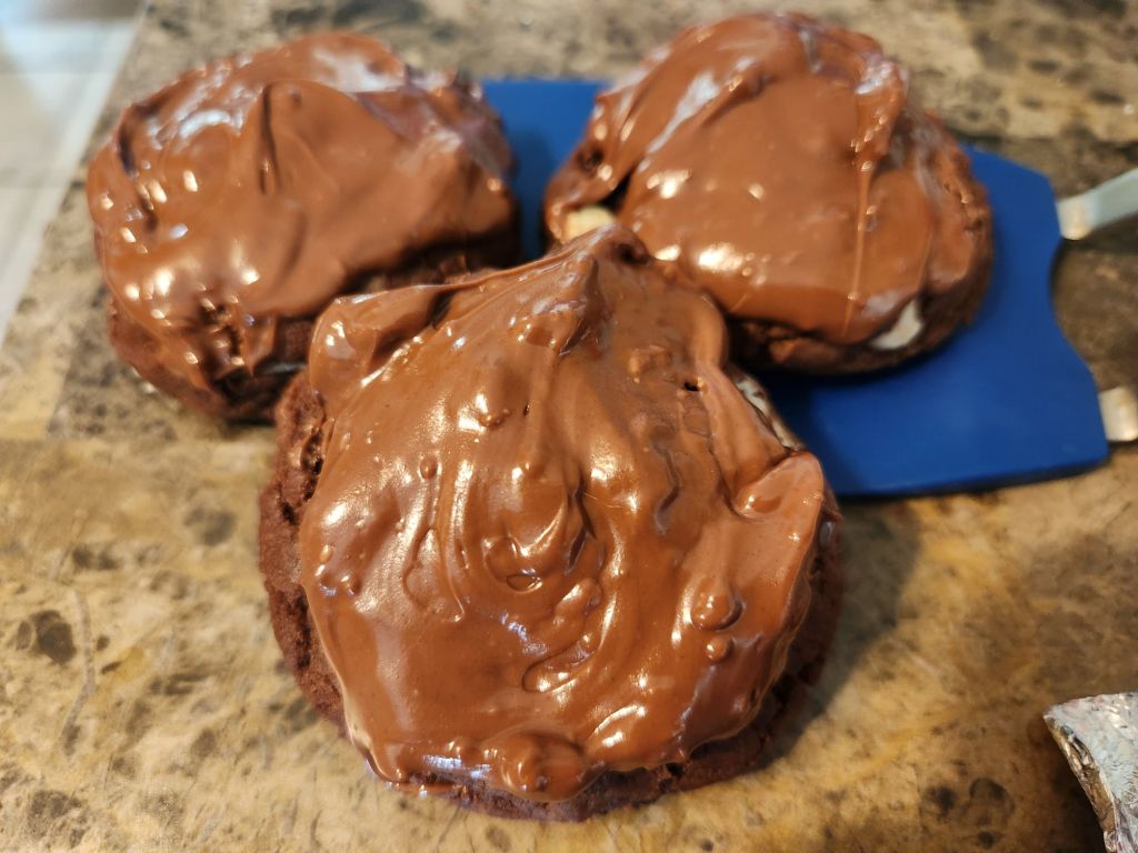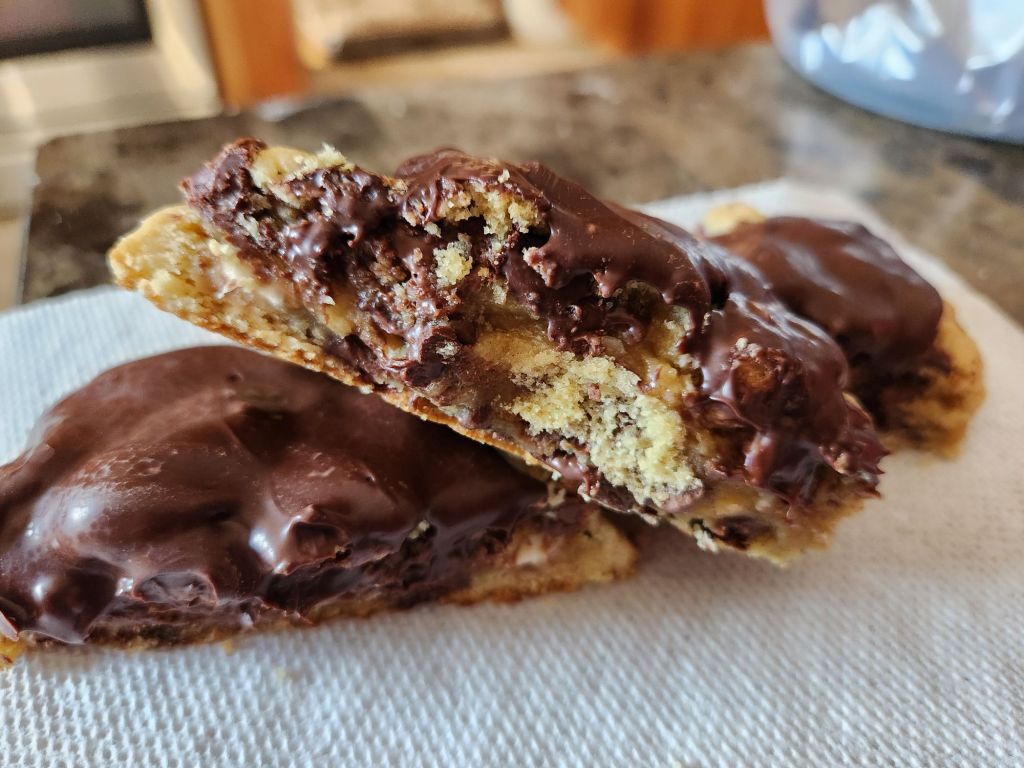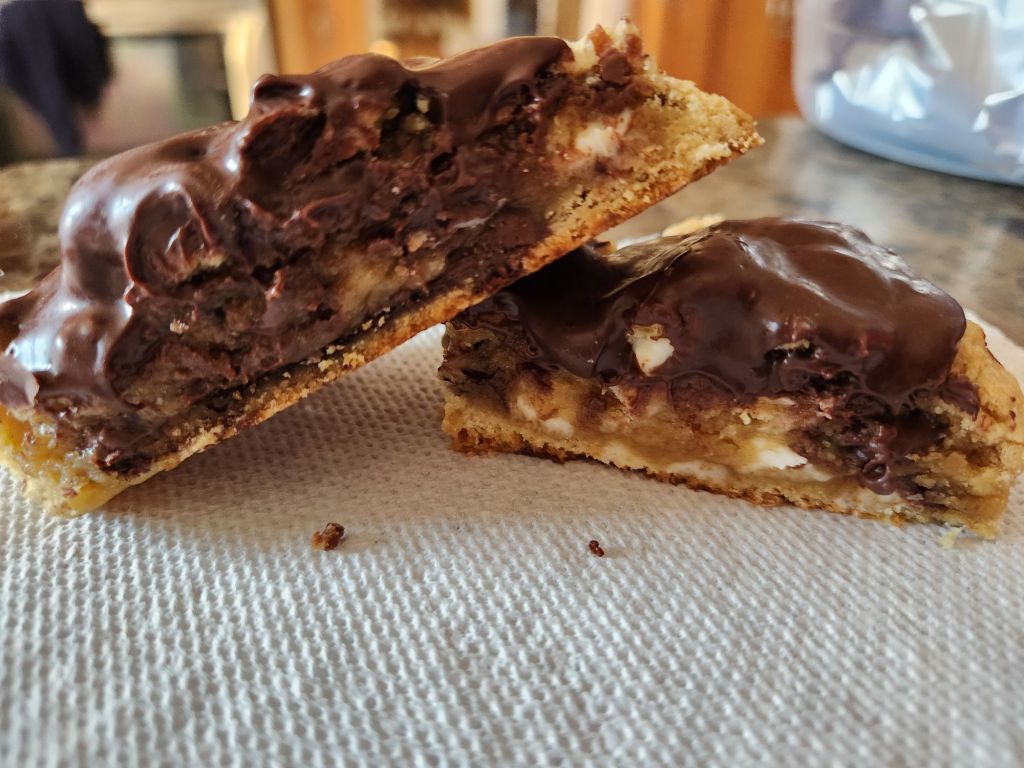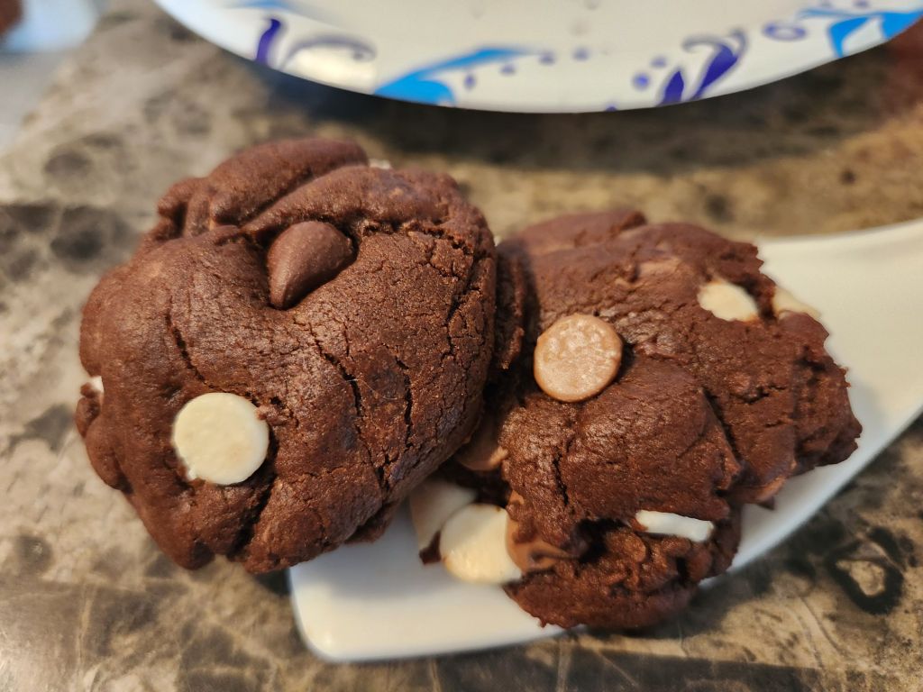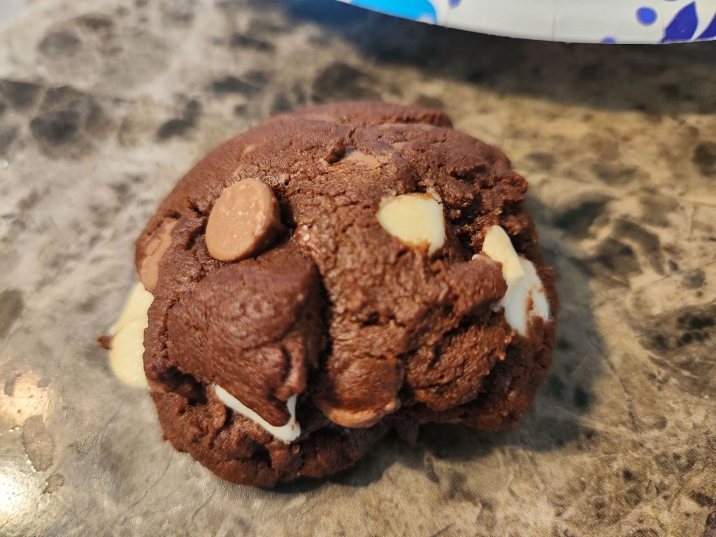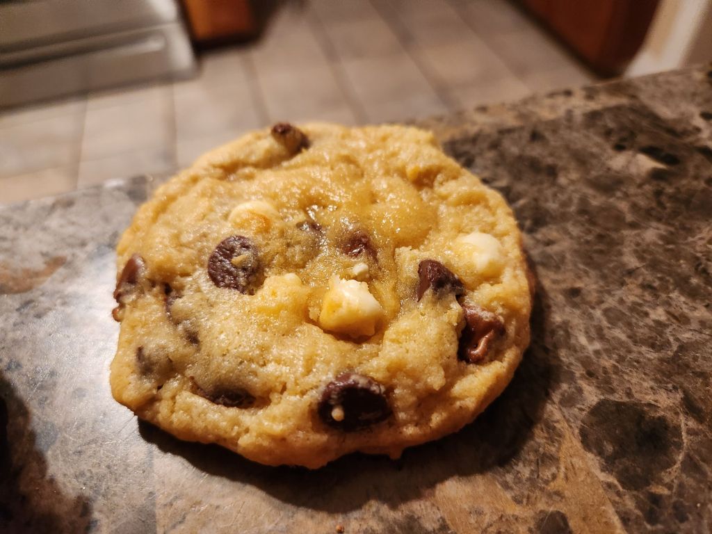 I stood for the entire second half of the Bills game, something I had not done in a long, long time. It alleviated some of the Fandom stress for me, and we were playing well while I stood, so I did not sit down until the game ended. We got a much needed win, so i asked Rob what the victory treats should be and he said triple chip cookies. They are a chocolate chip cookie dough with an instant vanilla pudding mix added and uses milk chocolate, white chocolate and semisweet chocolate chips. I was in a bit of a rush and didn’t have time to chill the dough, but they stayed niced and puffy anyways.