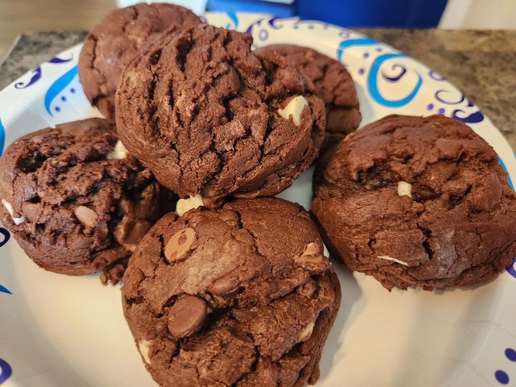 Directions – preheat oven to 350 degrees. Line a cookie sheet with parchment paper. Set aside. In a bowl, cream butter, butter crisco and brown sugar. Add pudding mix. Mix in eggs, vanilla, baking powder, baking soda and salt. Fold in flour. Blend in chips. Scoop out 1/4 cup dough. Stagger on cookie sheet. Bake 10 to 11 minutes, no longer. Remove from oven. Tops may look gushy, but cookies will firm up as they cool. Cool completely. Store in covered container.