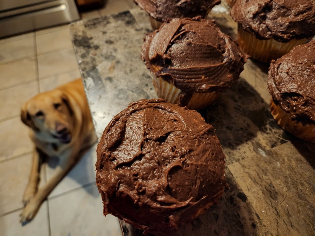 This weekend’s treat request from my chief taste tester was a yellow cupcake with a fluff filling, chocolate frosting, and a squiggle. I can’t master the look of the squiggle like Hostess, so really mine is a long blobby of a line. I used jumbo cupcake liners because larger cupcakes are easier for me to fill with filling. I used fat free free yogurt. You can use another type of greek yogurt or sour cream,if you prefer