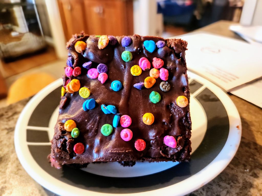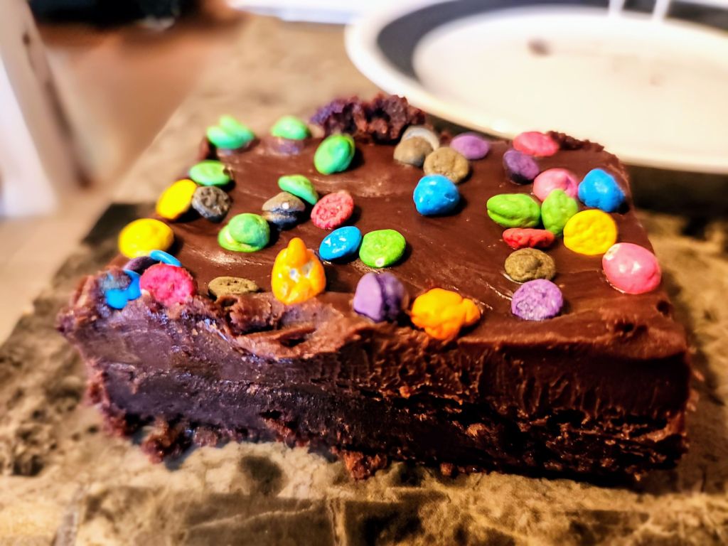 Calling all peanut butter lovers! This is for you. Peanut butter bars with finely ground peanuts, cut up Reese’s eggs smushed on top and frosted with peanut butter frosting.