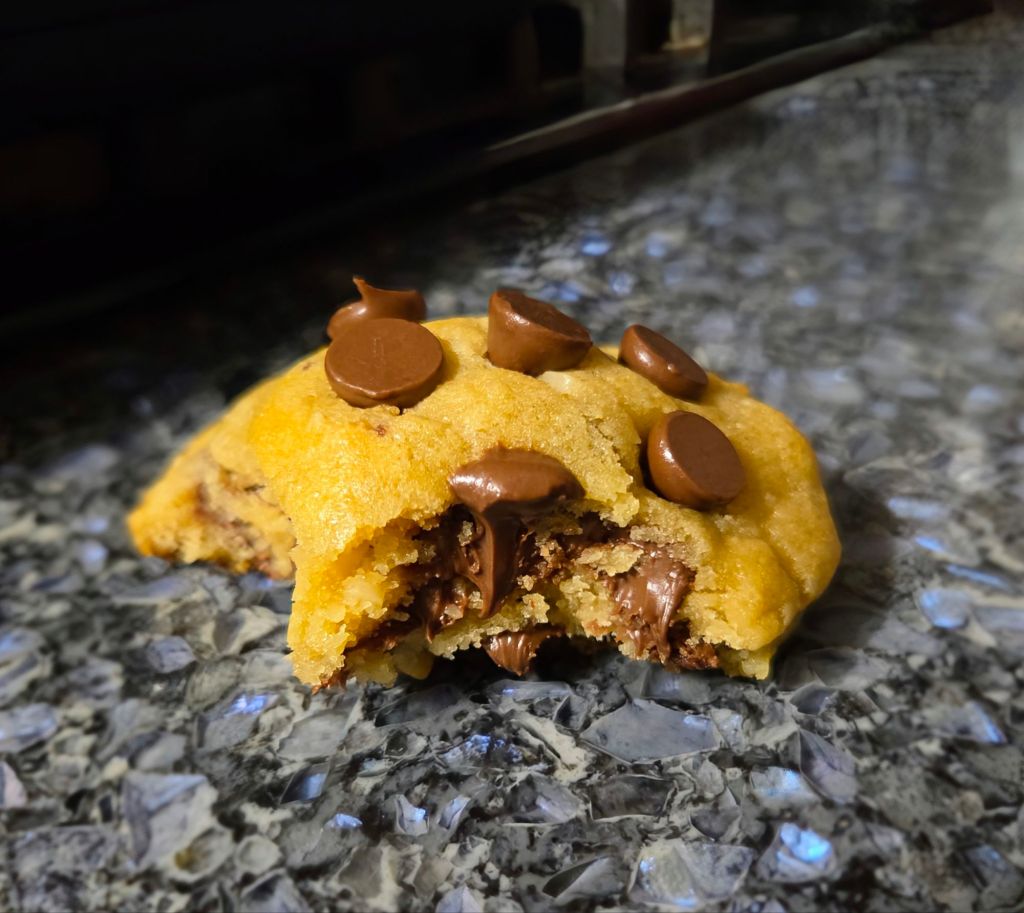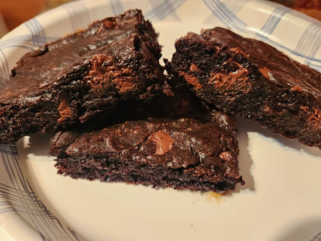 Directions – preheat oven to 350 degrees. Line a 9×13 cake pan with tin foil and spray with baking spray. Set aside. In a bowl, cream butter crisco, sugar, brown sugar and peanut butter. Add eggs and vanilla. Blend in dry ingredients. Mix in peanuts. Evenly spread into prepared cake pan. Gently press pieces of chopped up Reese’s eggs on top like so.