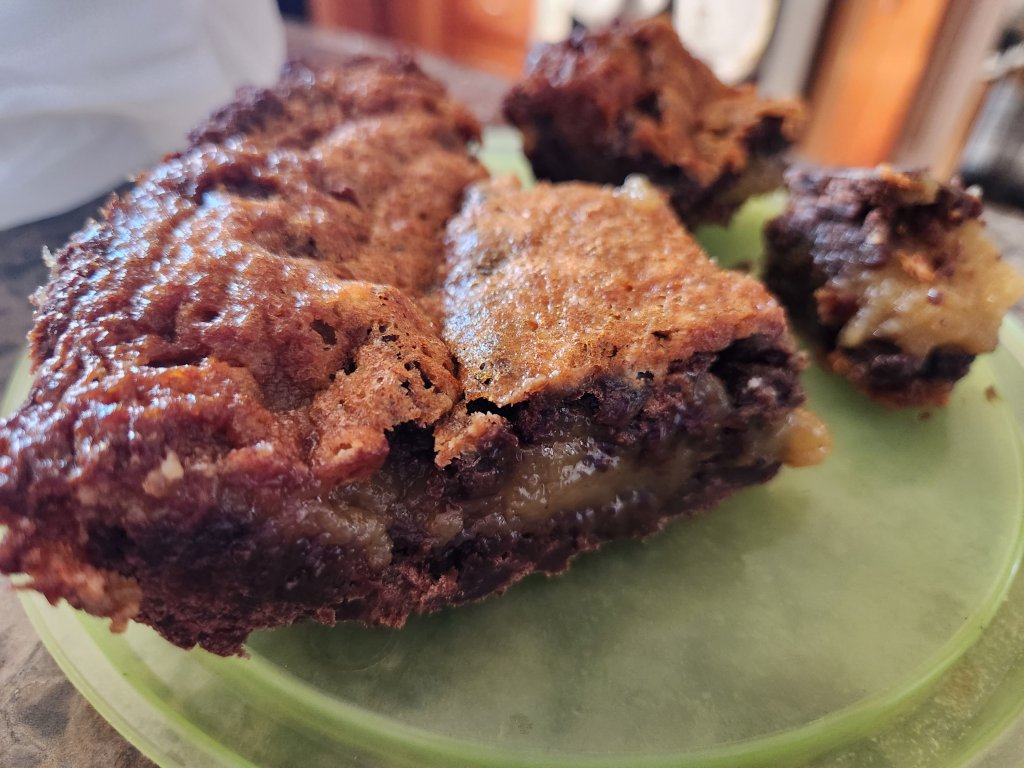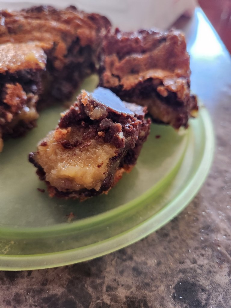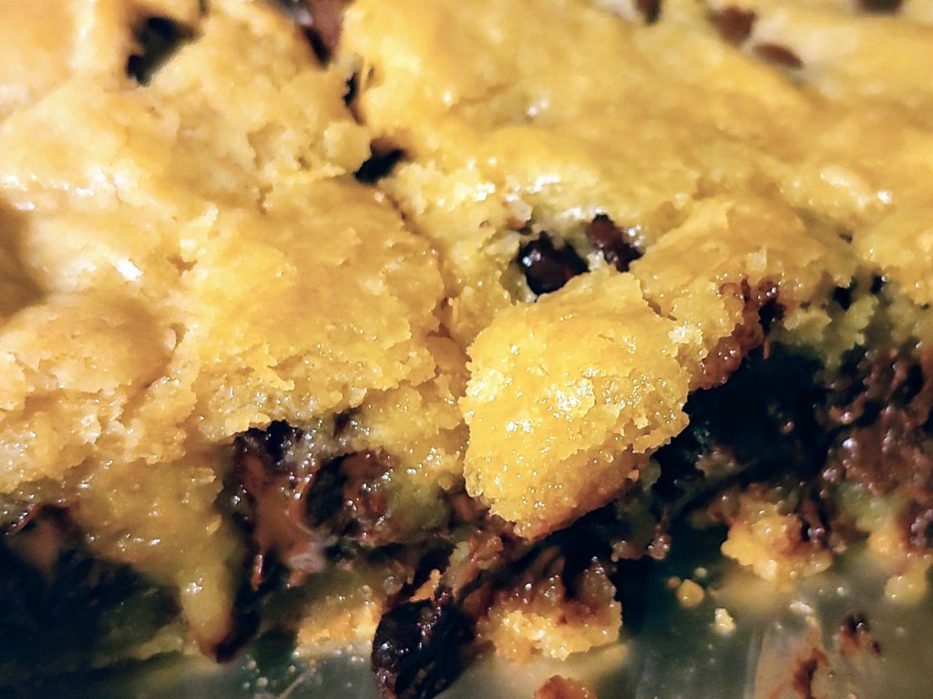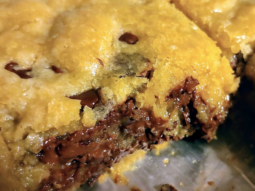 Directions – preheat oven to 350 degrees. Line an 8×8 pan with tin foil and spray with pam. Set aside. In a bowl, combine butter, sugar, brown sugar, eggs, yolk and vanilla. Blend in dry ingredients. Fold in 1 cup chips. Evenly spread into prepared pan. Sprinkle remaining chips on top and gently press into dough. Bake 30 minutes, no longer.