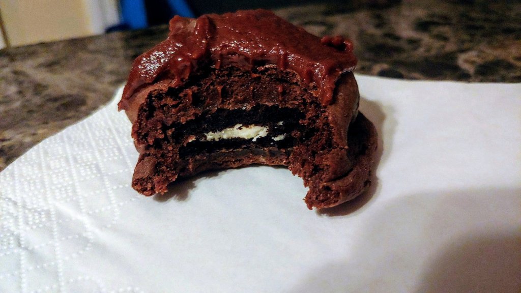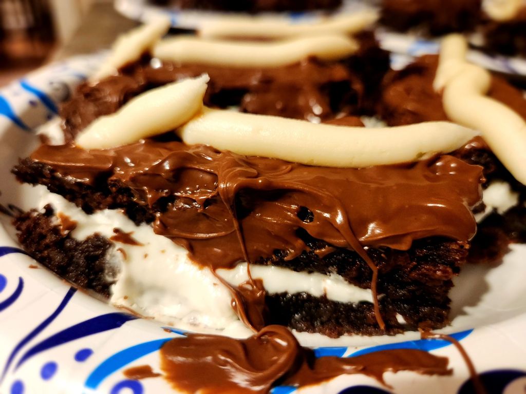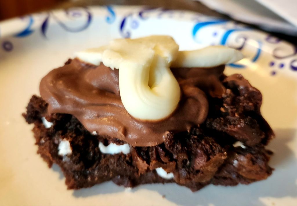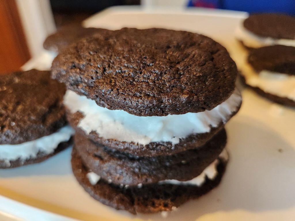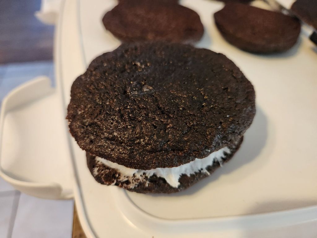 The hat trick of treats for the Bills victory Monday- brownie cookie sandwiches. These start with a brownie mix, also use some hot fudge. And the filling is a basic buttercream.