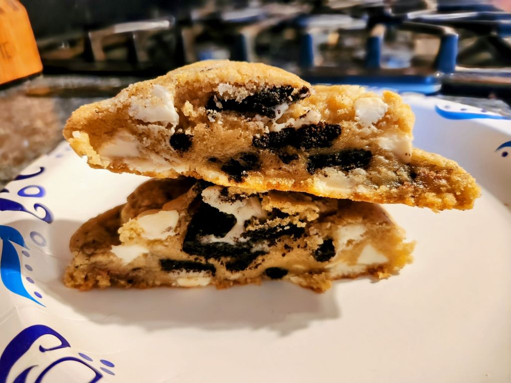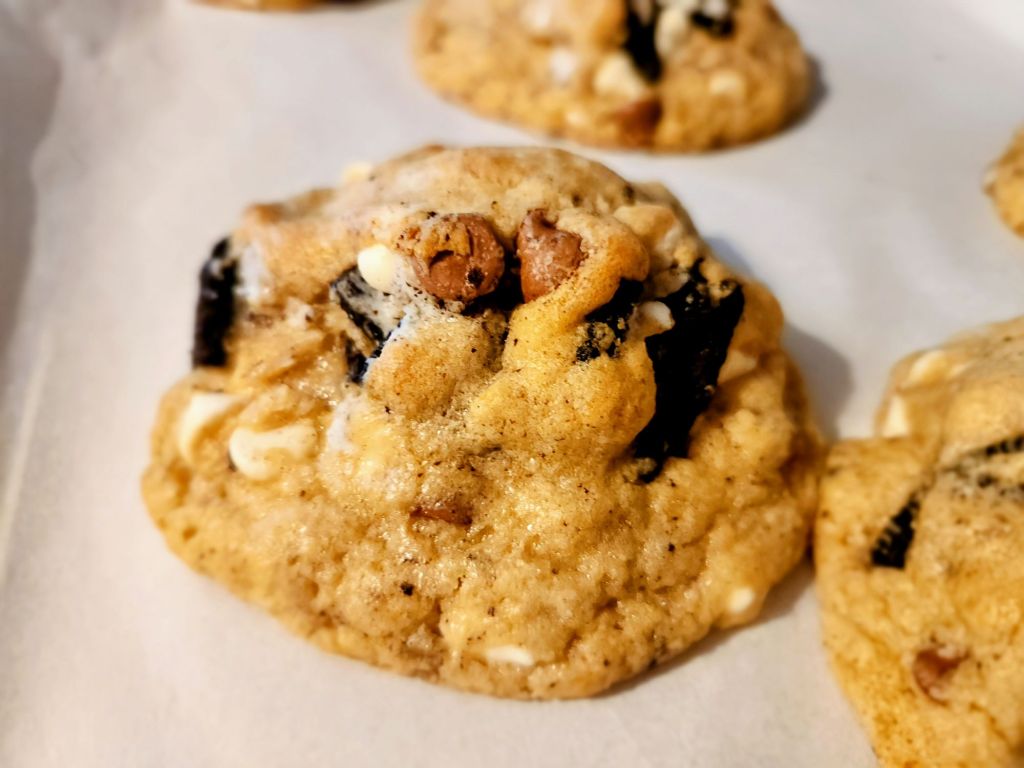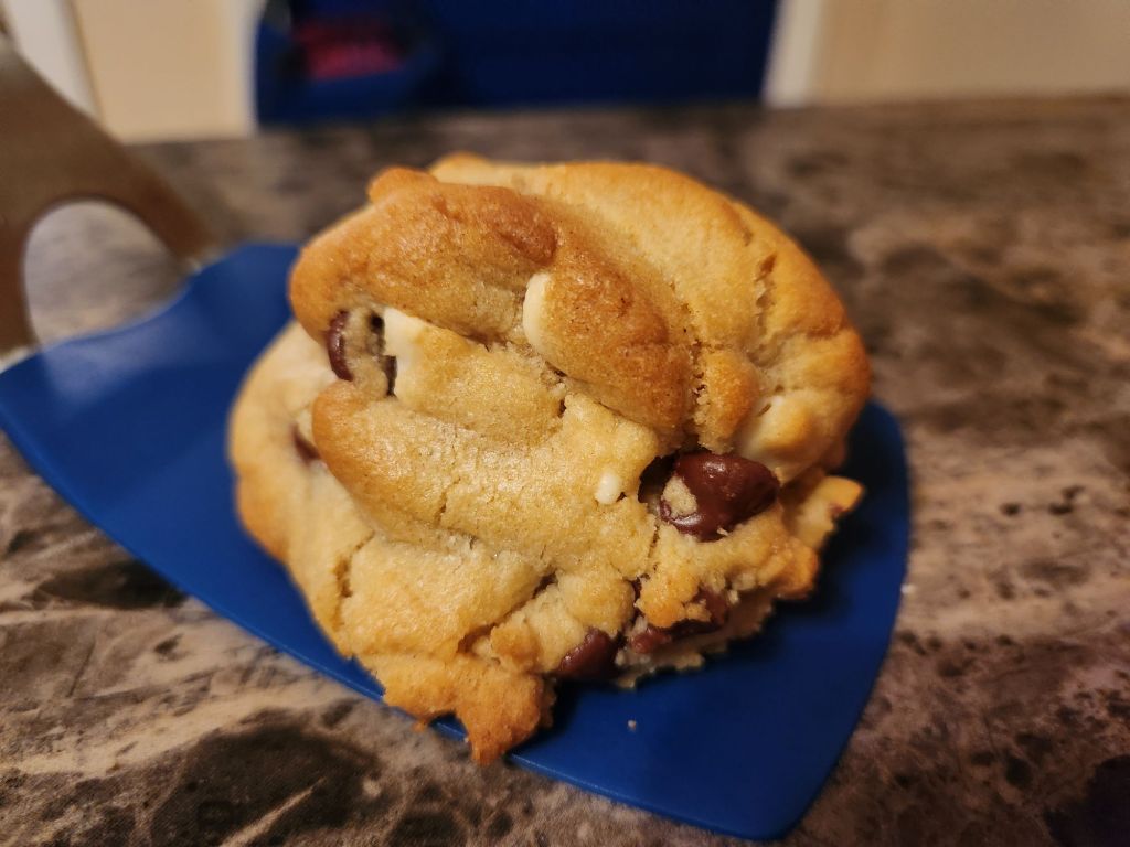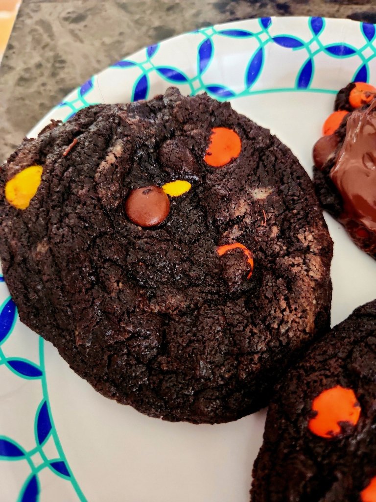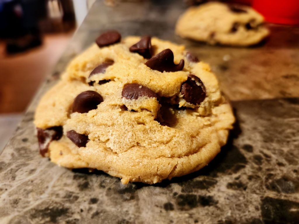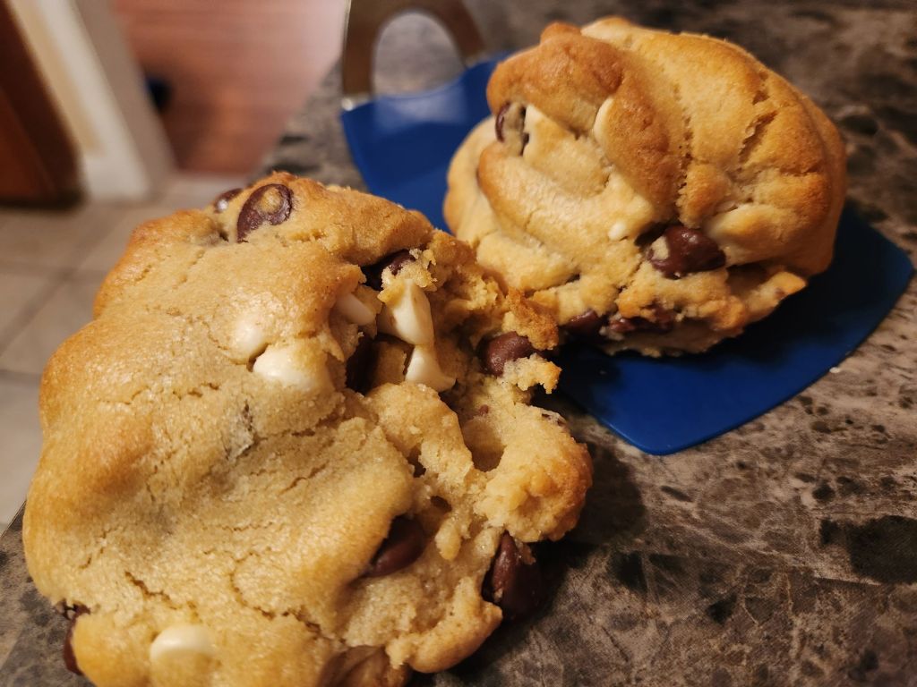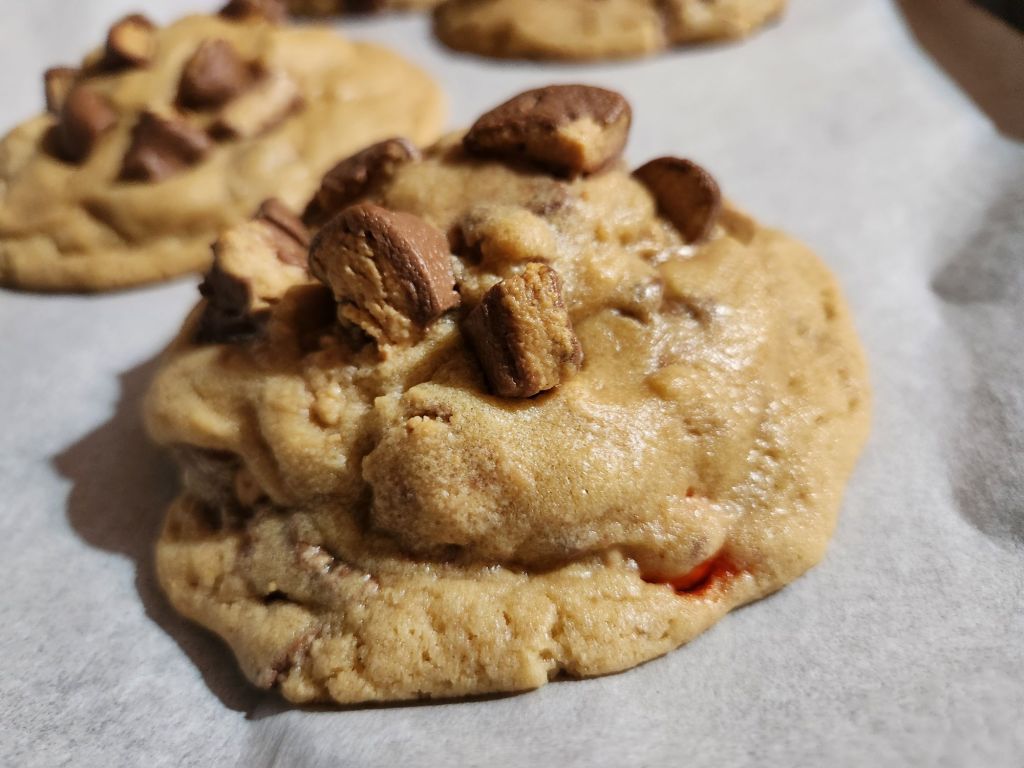Directions – in a pan, heat butter in a pan over medium heat, stirring occasionally, until brown specks form. Pour into bowl and place in fridge at least an hour. When you are ready to bake, preheat oven to 375 degreesm. In a combine butter, peanut butter, sugar and brown sugar. Add eggs, water and vanilla. Blend in dry ingredients. Scoop our 1/4 cups dough and roll tops in sugar. Line a cookie sheet with parchment paper and stagger cookies in a row of 2, then a row of one.